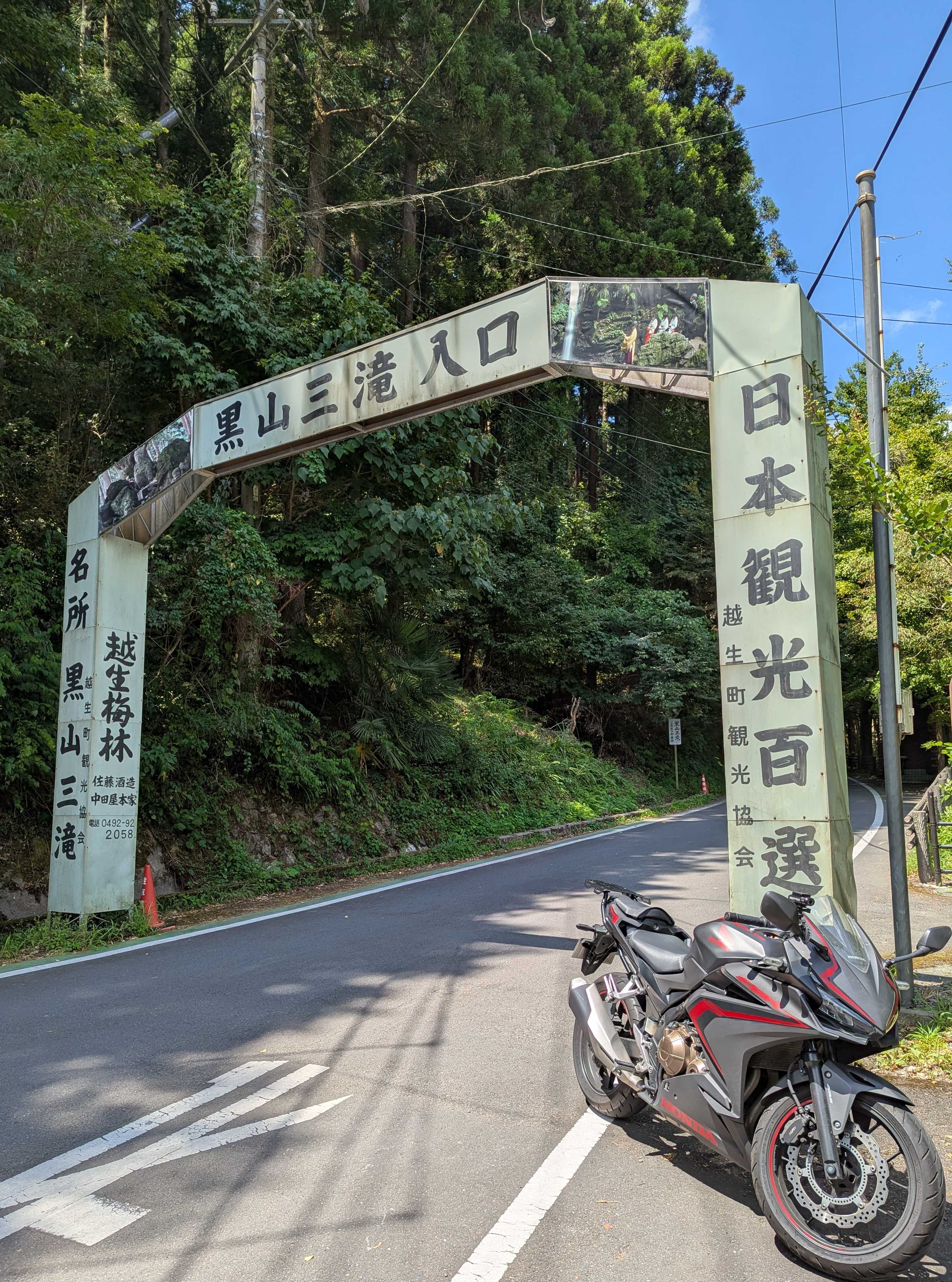 今日は暑いので涼🎐を求めて越生町の「黒山三滝」🏞️に行ってきました。黒山三滝に向かう道が気持ちよく🏍️ツーリングに最適です。“味のある”入り口が出迎えてくれます。この先に12〜3台分の無料駐車場があります。駐車場から歩いてすぐの所に「👺天狗滝」があります。更に奥まで歩くと上下二段の男滝(おだき)、女滝(めだき)があります。滝の横に設置してある温度計🌡️は28℃位でしたが、体感的にはもう少し涼しく感じました。😄夏休み期間なので、親子連れが数組いました。滝ですっかり癒された後は街に向かい(外観だけですが)登録有形文化財の金子家住宅を見てきました。立派ですね。こちらは生絹仲買取引などで財をなした嶋野伊右衛門の店舗兼住宅として、江戸時代末期に建築されたそうです。同じ通り沿いで直ぐ先に岡野家住宅店蔵(おかのけじゅうたくみせぐら)がありました。希少な土蔵造3階建の店蔵です。(こちらも外観のみ見学)立派ですね。どちらも中に入ってみたいですね~😄お昼は隣町の「毛呂山食堂」に寄りました。名前に惹かれて「🐷豚玉毛丼(ぶったまげどん)」を注文しました。親子丼の鶏が豚に変わっていました。“毛”は入っていませんでした😅味噌汁が好みの味でした。※豚玉毛丼はメニュー左下です。食事中に焼きそばを持ち帰る人が何人かいたので、次は焼きそばを食べたいと思います。