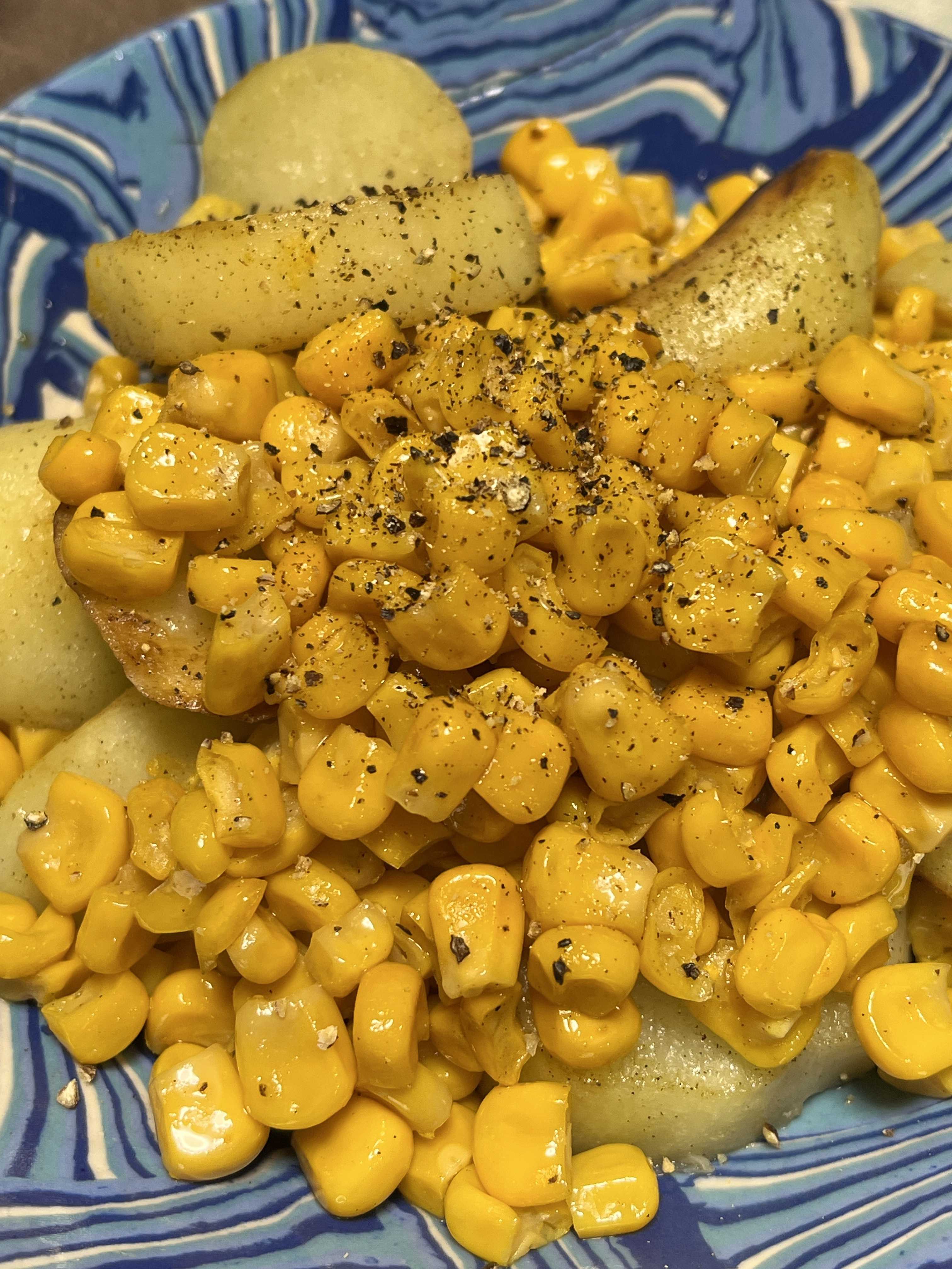 じゃがいもとコーンはシンプルにオリーブオイルで炒め黒胡椒をたっぷり