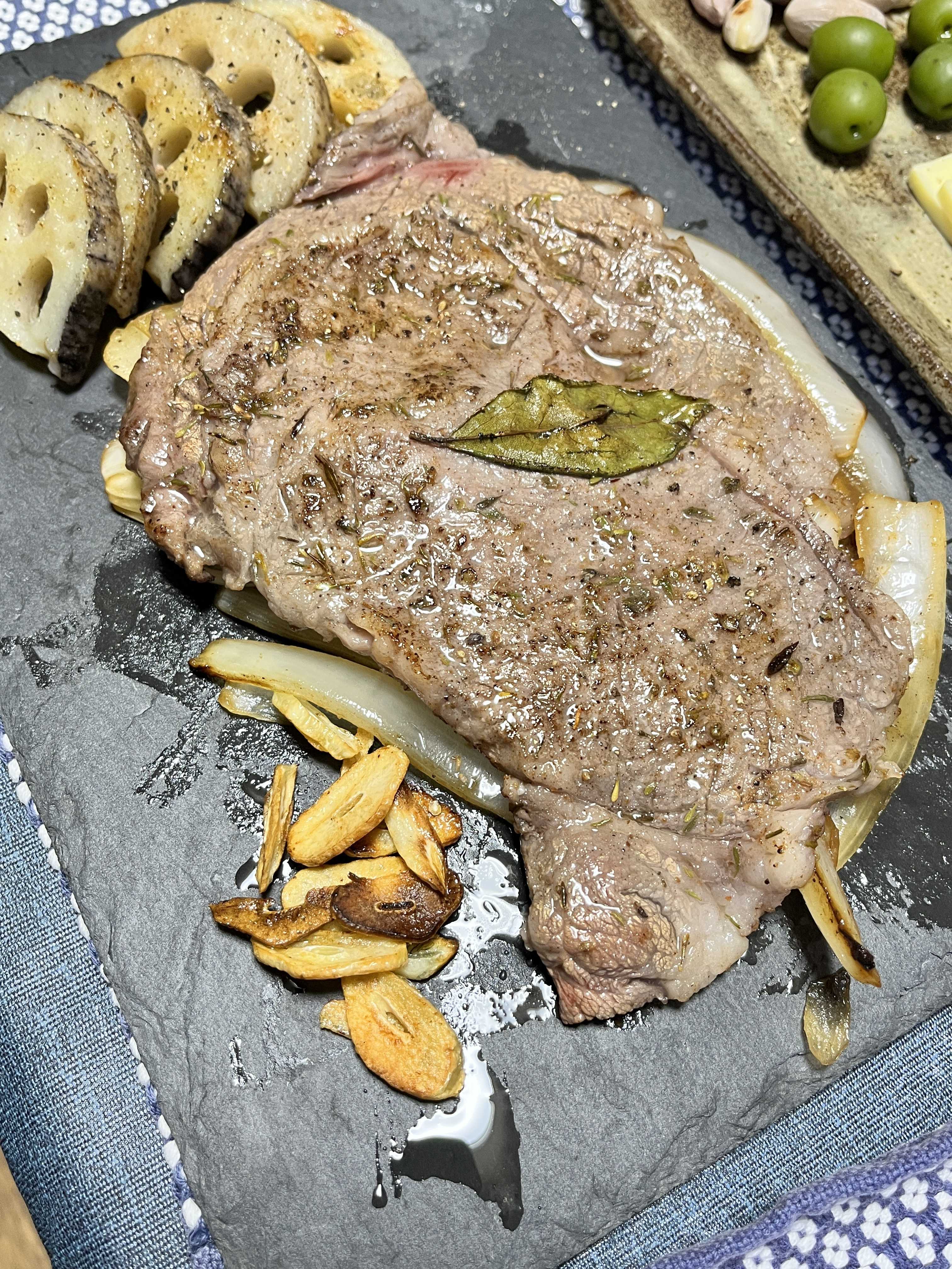 ステーキの下に淡路島産の玉葱を炒めてひいてみました ちょっと焦げ目をつけて 香ばしく焼き上げると 甘味も増して ステーキとめっちゃ合う❣️ 添えた蓮根のステーキも塩胡椒だけでシンプルさつまいもはバターとレモンと白ワインで煮てみました干し葡萄がいいアクセント✌️今年初の新漬けオリーブ🫒が小豆島から今日届きました💕毎年この時期のお楽しみです♪銀杏は茶封筒に殻ごといれチンします熱いうちに殻を割って塩でいただきます🥰これも今の時期しか食べられないご馳走です💕今日もご当地の旬の食材満載👍親父の晩御飯奈良県産リブロースステーキ蓮根ステーキサツマイモのレモンバター煮ちぎりキャベツゆで落花生小豆島の新漬けオリーブプロセスチーズ銀杏青森産黒にんにくイタリア産赤ワインドン アンジェロ キアンティ お寄りいただけたら幸いですm(__)m