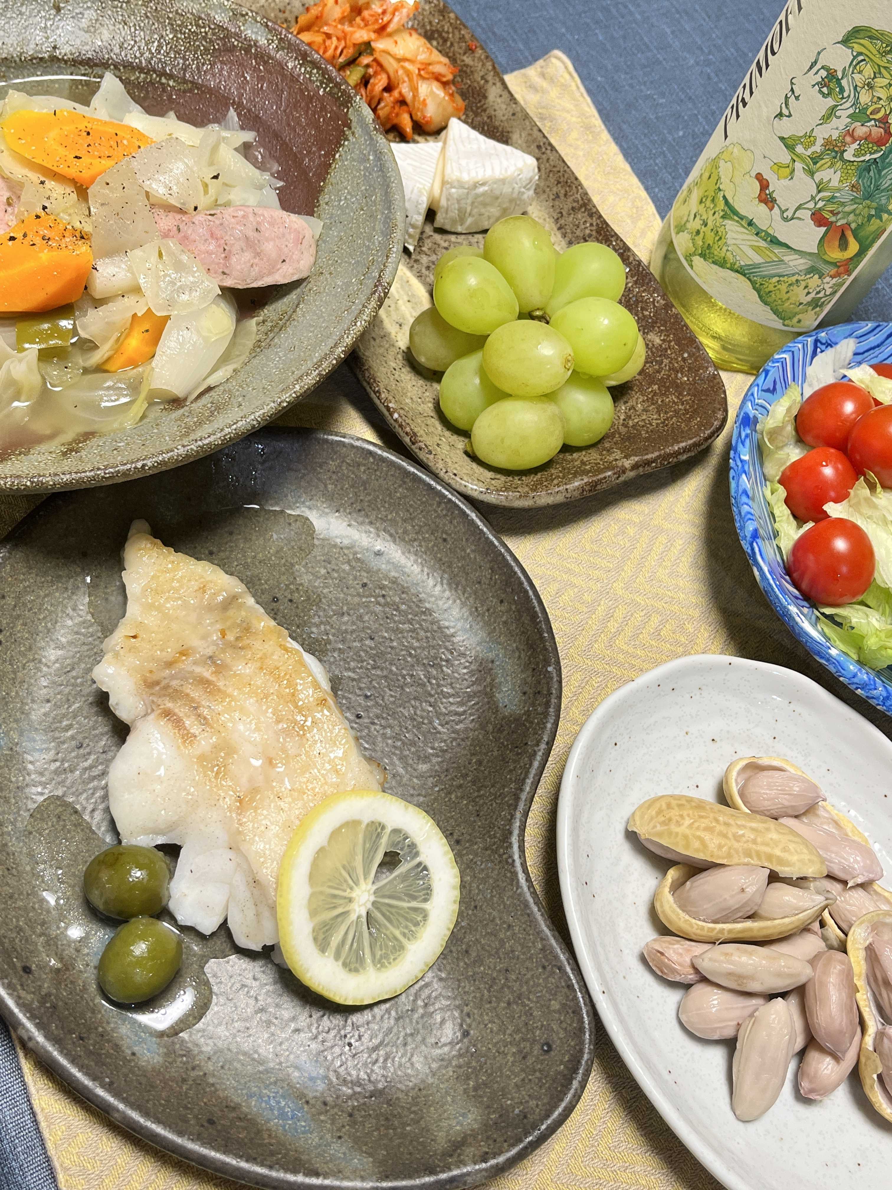 親父の晩御飯堀たてジャンボ落花生の塩ゆでタラのムニエルレタスのサラダキムチカマンベールチーズ青森産黒にんにくシャインマスカットポトフイタリア産白ワインテッレチェヴィコ プリモフィオーレ シャルドネ今日の主役はジャンボ落花生🥜朝から堀に行って来ました💪土から掘り起こし実をもいで水洗いし40分茹でますほっくほくの茹で落花生ができました♪これは収穫した人にしか味わえない特権です👍白ワインにも赤ワインにもビールにも合いますよ♪タラもプリプリでタルタルソースはらっきょうとマヨネーズを和えただけレモン🍋を添えてgood👍シャインマスカットがお手頃だったので白ワインに合わせたくて思い切って買いました😅大正解❣️そのままではもちろん甘くて美味しいんですが白ワインに浮かべればマリアージュ💕💕白ワインも美味しいしマスカットも倍美味しい😋落花生堀りの疲れも吹っ飛びました😆 お寄りいただけたら幸いですm(__)m