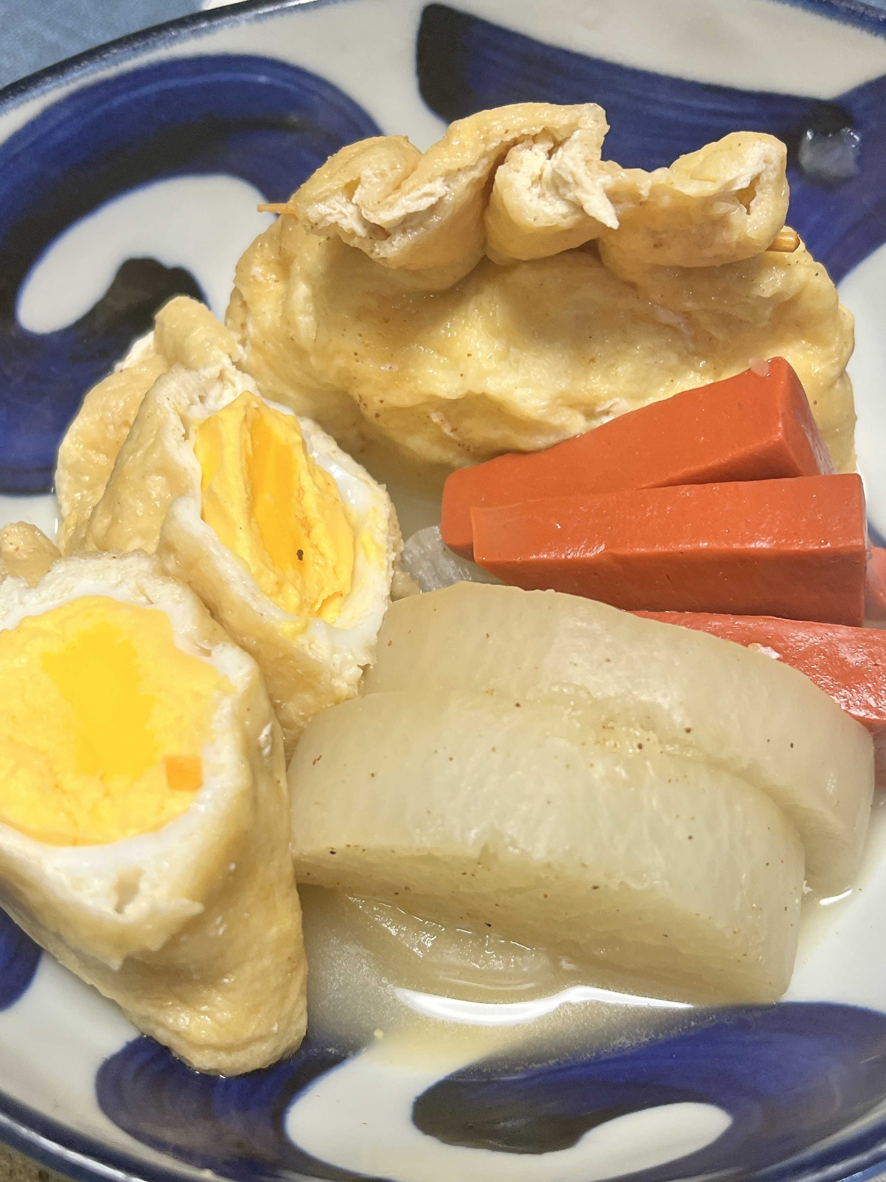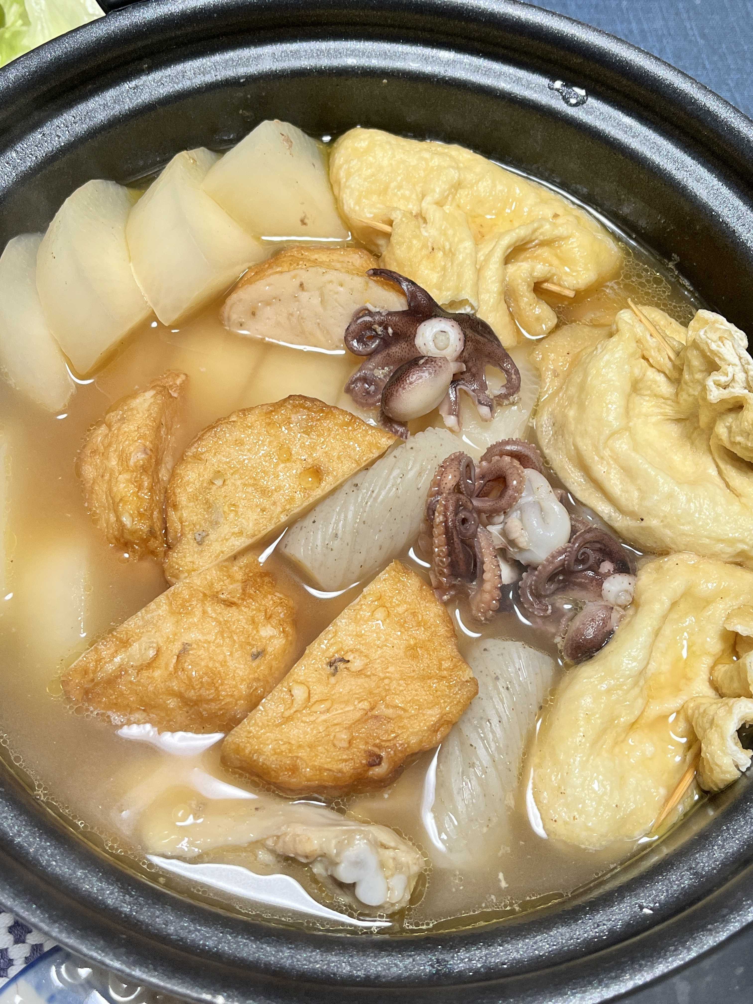 なんか急に寒くなりましたね〜😨で、おでんが食べたくなります♪手羽元と昆布で出汁をとって大根、蒟蒻、さつま揚げ、お袋煮今日の具材はそれだけです😅冷凍してあったイイダコを少し入れてみました😆生姜🫚をつけていただきます温まるし美味しいですよ〜🥰山芋のグラタンもアッツアツで美味しい〜すりおろした山芋に刻み葱と出汁、なめ茸、チーズを加えてグリルで焼きますなぜか日本酒にも合う👍ハマチもコリコリして美味しいです✌️ラディシュはご近所農家さんからいただきましたメチャクチャ新鮮でシャッキシャキ😆 いよいよ食欲の秋が始まりますね♪晩御飯イイダコ入りおでん山芋グラタン愛媛産天然ハマチのお造りラディッシュとレタスのサラダキムチ枝豆青森産黒にんにく香川県産ひやおろし国重 お寄りいただけたら幸いですm(__)m今日の晩ごはん#おうちごはん#晩ごはん#晩酌#旬#旬の食材#旬の野菜#おいしい#美味い
