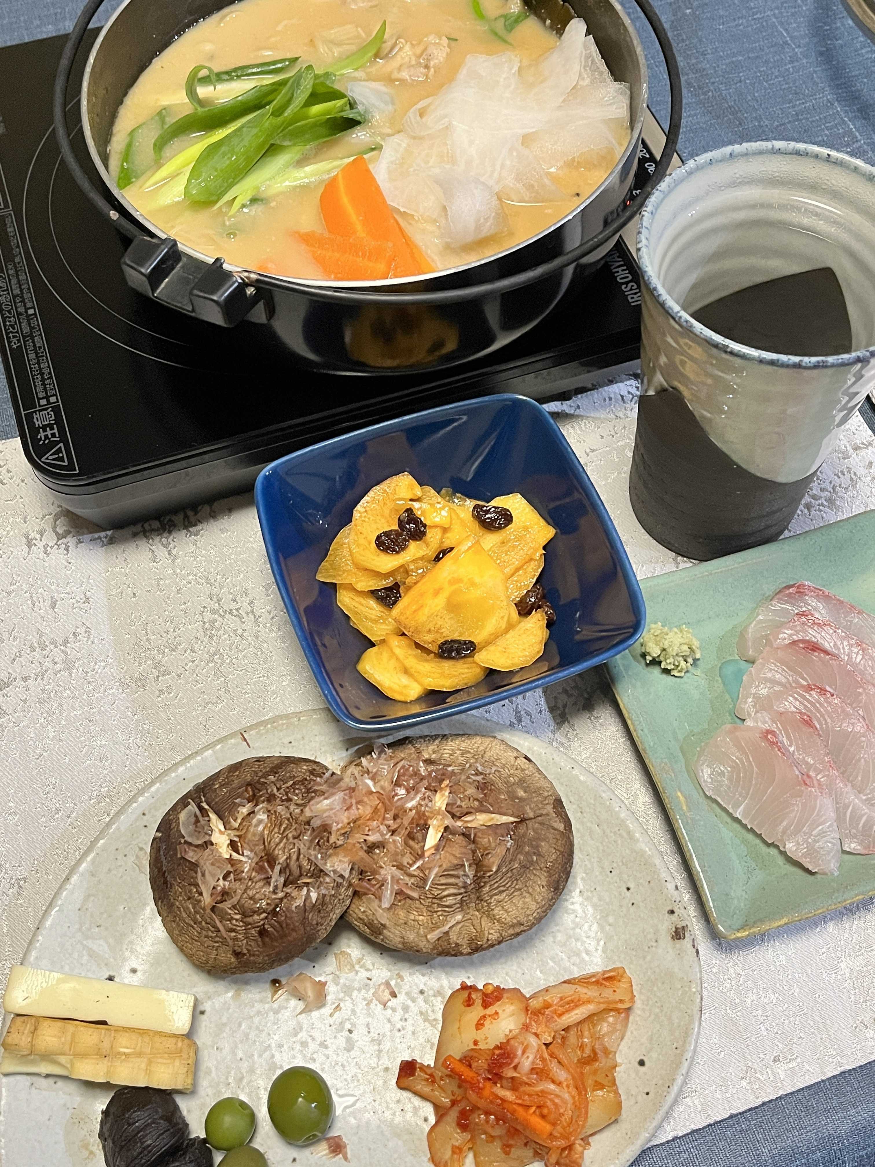 親父の晩御飯粕汁鍋長崎産ひらまさのお造り徳島産ジャンボ椎茸焼きおかか醤油キムチ自家製燻製チーズ小豆島産新漬けオリーブ青森産黒にんにく柿と干しぶどうのマリネ免疫力アップ‼️‼️きのこたっぷりの酒粕汁でお鍋をしました♪八海山の粕を使って根菜、きのこ色々、鶏肉、揚げ等うまーい😍染み渡る美味しさ💕ひらまさのお造りはコリコリ❣️ジャンボ椎茸はプリプリ❣️柿はマリネにしたのでしっとり❣️食べ過ぎ注意⚠️です寒い日のお鍋と焼酎お湯割り締めのおうどんサイコーです☺️☺️ お寄りいただけたら幸いですm(__)m