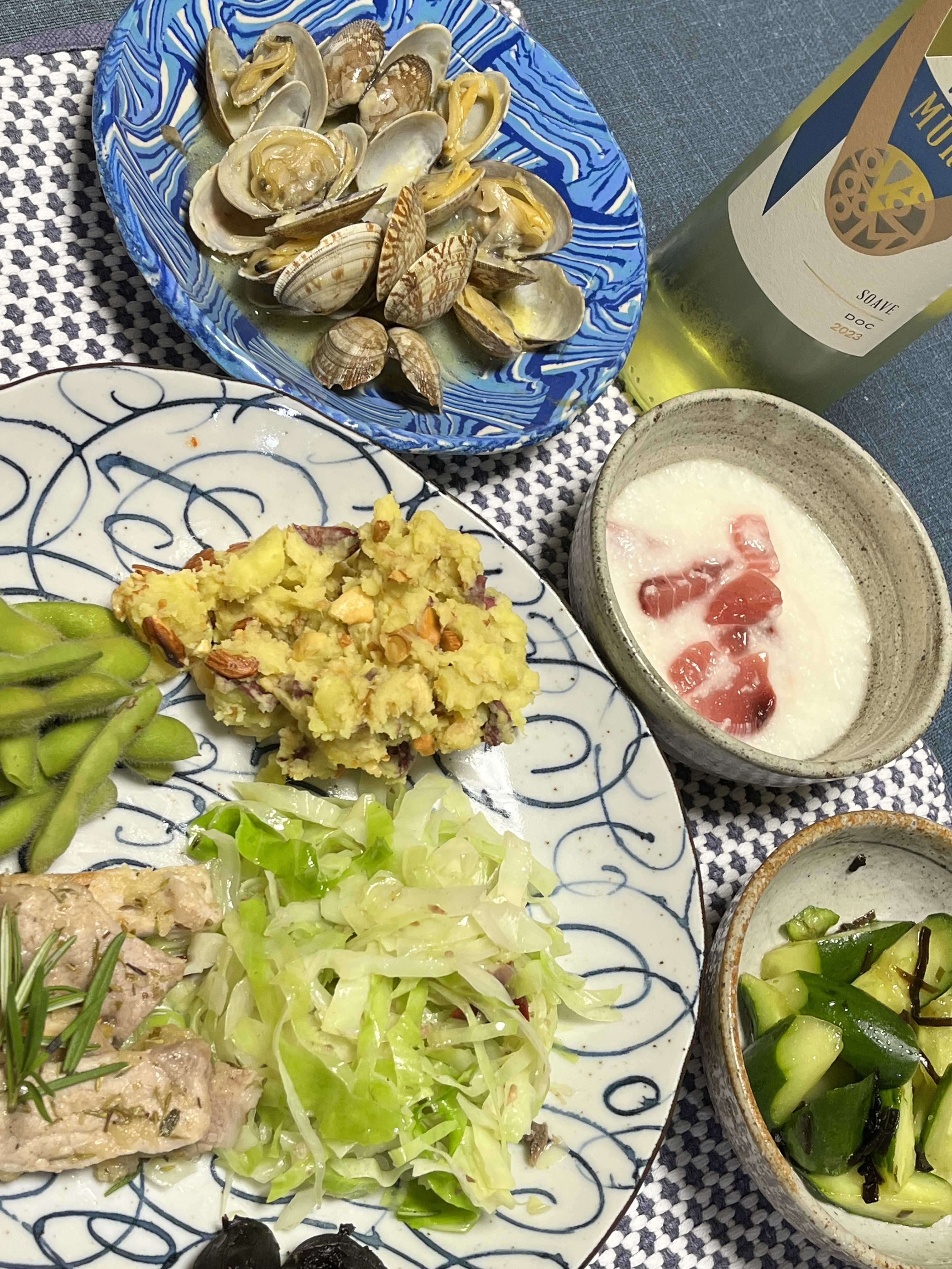 親父の晩御飯あさりのワイン蒸しナッツ入りサツマイモのサラダ枝豆アンチョビキャベツ豚ロースの香草パン粉焼きやみつききゅうりマグロすきみ入りとろろ青森産黒にんにくイタリア産白ワインヴィッラ ムーラ ソアーヴェさつまいも🍠をいただきました♪まずはナッツ入りサラダですよね😉昨日いただいた枝豆もたっぷり湯掻いて残っていたキャベツはアンチョビと炒めいただいきもののきゅうりも塩昆布と胡麻油とあえて食べ切りましょうアサリも実は冷凍庫から出てきたんです笑😆豚ロースをローズマリーとスパイスで焼きパン粉を振って仕上げますトロロにはちょっとだけマグロのすきみを入れて今日もお家ご飯はALMONDE299円引きクーポン!黒にんにく 1kg 正品 青森 送料無料 (500g×2個) 約3か月分【くろにんにく 熟成】【黒ニンニク A品 黒宝 1kg】【黒にんにく 1kg】【熟成黒にんにく 青森】【黒ニンニク 国産 くろにんにく】【税込5921円】黒にんにく 訳あり 【500g,1kg,2kg】 バラ 送料無料 / 福地ホワイト六片 くろにんにく 黒大蒜 にんにく お取り寄せグルメ 健康食品 スタミナ アウトレット 冷え 対策 |農家の誇り波動熟成黒にんにく【送料無料】イタリア白ワインの旨安チャンピオン「ヴェルディッキオ」飲み比べ6本セット ワインセット 白 白ワイン ヴェルディッキオ イタリアワイン マルケ (750ml×6) お寄りいただけたら幸いですm(__)m