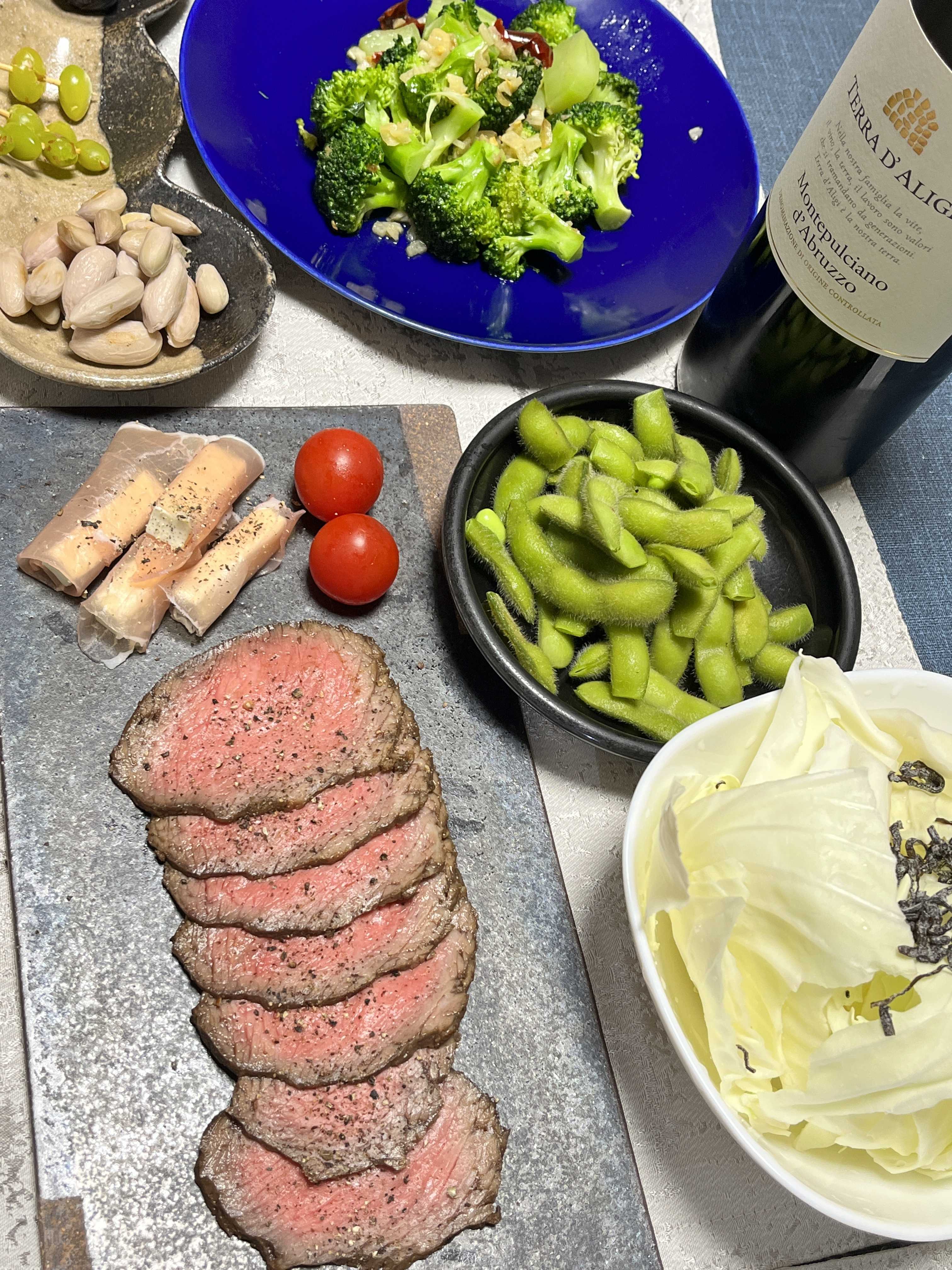 親父の晩御飯黒毛和牛のローストビーフクリームチーズの生ハム包み茹でジャンボ落花生銀杏ブロッコリーのペペロンチーノ枝豆ちぎりキャベツ青森産黒にんにくイタリア産赤ワインテッラ ダリージ モンテプルチアーノ ダブルッツォ公園に落ちていた銀杏を持って帰ってなんとか食べたい❗️と思い初挑戦💪まずバケツに水を張り酢を入れて身を剥きやすくする工程一度に全部は無理❗️と思い20粒ほど剥いたものを何日か干して乾燥させましたヒビを入れたものを封筒に入れチン❗️熱いうちに殻と薄皮を剥くと緑色の銀杏が出現❣️感動🤣しかし❗️なんと手間のかかることか💦20粒を制するのが精一杯でも頑張った甲斐あって塩をつけてビールのアテにはサイコー🥰おまけに今日は枝豆🫛を大量にいただいたので枝からちぎって茹でましたこれまたビール🍺に合う❗️❗️ローストビーフ🥩がかすむほど豆が主役のお家ご飯でした😋 お寄りいただけたら幸いですm(__)m