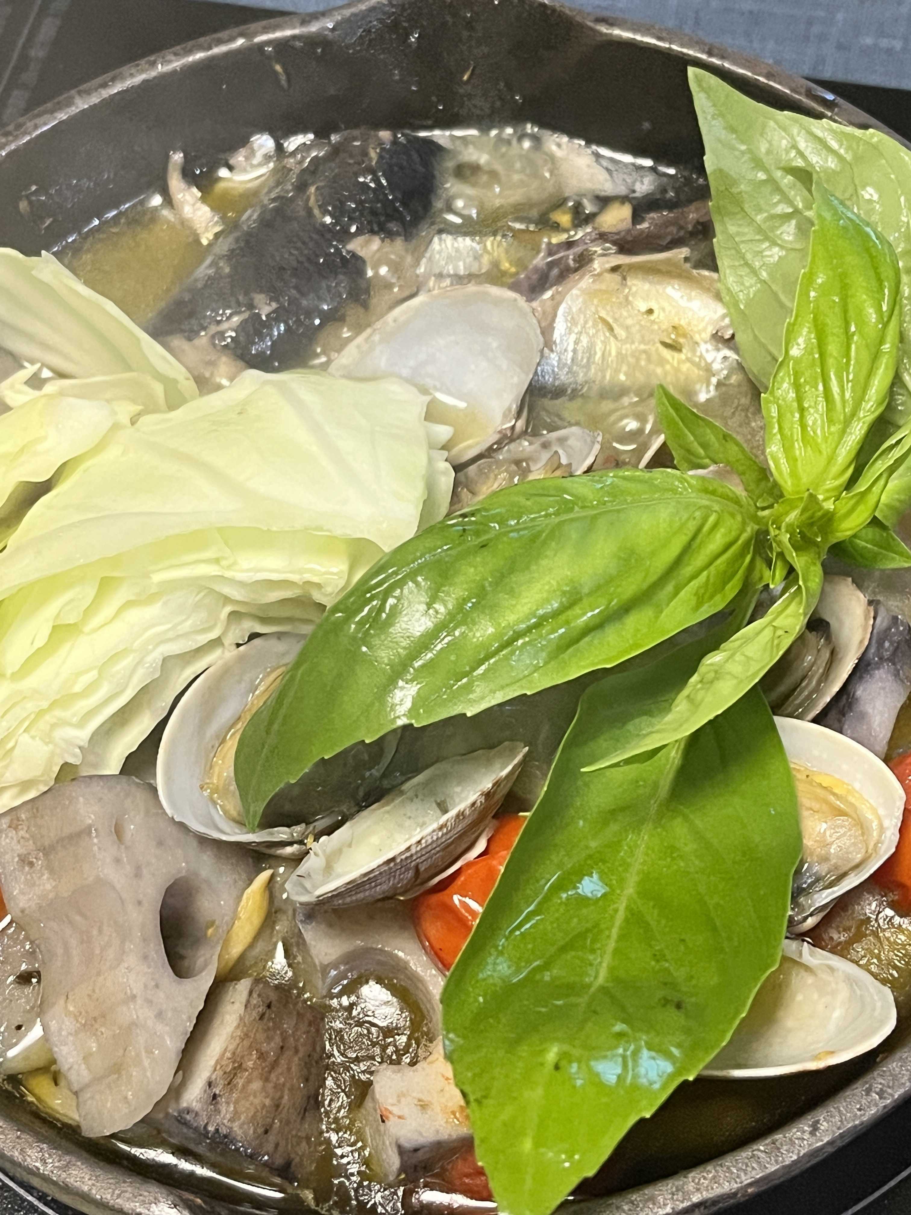 親父の晩御飯秋刀魚とアサリのアヒージョ上杉豆プロセスチーズ青森産黒にんにくバケットイタリア産白ワインプリモフィオーレ シャルドネ旬の秋刀魚をアヒージョにしてみました3枚におろして背骨と内臓をとり、お酒で洗って塩を振り余分な水分を拭き取って下拵え完了👍にんにく、鷹の爪!ローズマリー、ローリエを入れたオリーブオイルを熱しアサリを投入白ワインを入れて口が空いたら蓮根、ミニトマト投入蓮根が柔らかくなったころに秋刀魚投入キャベツを入れて一煮立ちバケットもこんがり焼いた方が美味しいかな😋アヒージョのオイルにバケットを浸し秋刀魚をのせるもよしトマトとバジルもよしもちろん何ものせなくても美味しい👍👍もうちょい白ワインが飲みたくて缶詰のスモーク牡蠣を開けちゃいました笑また明日からお仕事がんばろ〜👊 お寄りいただけたら幸いですm(__)m