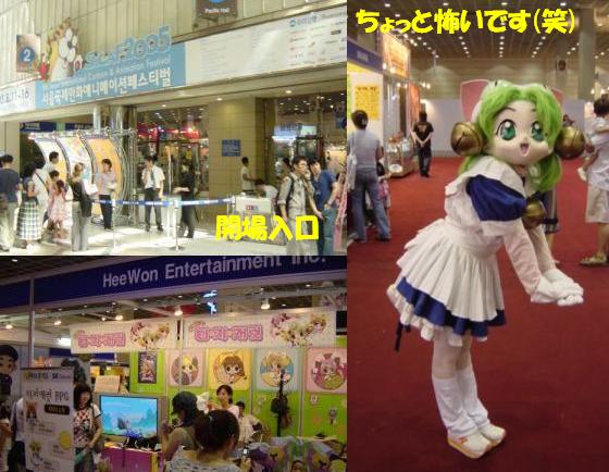 香港から韓国までは、飛行機で3時間程度。東京に戻るよりは、やや短い距離です。日曜日の大韓航空のフライトは前便満席という盛況ぶり、韓国人気の片鱗がうかがえました。(ちなみに機内食は、ビビンバでした。具とご飯が別々に出せれ、自分で混ぜるというものでしたが、食事の時間が始まると、機内には何とも言えない辛さと酸っぱさが混じった匂いが充満しました)今回の出張は2泊3日でしたが、打合せなどの仕事が詰まっていて、ろくに市内も見ることができない過密ぶりでしたので、抗日戦勝60周年記念で、市内は盛り上がっていたようなのですが、全くその気配すら感じることができませんでした。それだけ仕事をしたのにも関わらず、商談の方は惨憺たる有様で「あーあ…」という感じなのですが、もう1つの目的であったアニメフェア「SICAF 2005(SEOUL INTERNATIONAL CARTOON & ANIMATION FAIR)」の見学は有意義でした。私の仕事は玩具関係なので、アニメや漫画とは切り離せない関係と言う事になり、こういう展示会は、業界同志の交流、仕事の拡大には欠かせない場所になります。子供の歓声で包まれるアニメフェアの裏側で暗躍するおじさん業界人達…どの業界でも同じですが、ちょっと怪しいですよね(笑)韓国のアニメ事情ですが、韓国オリジナルというのは、そう多くありません。ほとんどの場合、日本のアニメを吹替えで放送しています。これは、香港、中国、台湾等々のアジアの国々では同じ事が言えます。海外の旅行先でテレビをつけたら、ドラえもんやクレヨンしんちゃんを放送してたなんて経験はあると思います。漫画等の原作があってアニメ化というのが通常のパターンですが、韓国などでは、ネットゲームからアニメ化という動きが加速してきています。韓国でも、ネットカフェでオンラインゲームを50時間遊び続けた若者が急死するという事件があったように、ネットゲームユーザーは何十万人も存在します。そのゲームをアニメ化したり商品化したりすれば、隠れファンは相当数いますから、かなりの視聴率や商品お売り上げが期待できるわけですね。なので、会場で初めてみるキャラがあって、こんなアニメがヒットするのかな?なんて思っても、実はネットの世界では、かなり有名な存在だったりするというケースが多いんです。日本でもネットゲームは有名ですが、人口比率で言っても韓国・中国ほどのレベルには至っていません。でも、やがて日本でもかなりのユーザーが増えるでしょうから、ネットゲーム発信のアニメというのが、今以上に増えていくと思います。