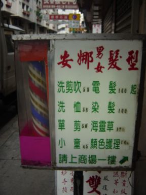 路地裏を歩いていたら、ひなびた感じの散髪屋の看板を見つけました。香港・中国では、日本と比較できないほど散髪料金が安いです。理容師の免許が必要かどうか知らないのですが、大小様々なお店が多く、値段もマチマチで過当競争状態です。街中では、お洒落な美容室もあるのですが、ローカルな下町にいけば、おばちゃんが路地に椅子を置いて商売していたりします。うちのスタッフは、洗髪無しですが10香港ドル(約150円)でやってもらったと言ってました。(ちょっと昔の子供みたいなヘアスタイルになってましたが…)日本人の場合は、日本人が経営している店or日本に出張に行った際に寄ってくるという場合が多いようです。香港にも日本人が経営している理容室や美容院があります。理容室の場合、一式5000円程度ですから、日本とそう変わりません。でも、女性が行く美容室の価格はピンキリで、何万円というケースもあるそうです。私は、仕事で帰国する事が多いので、飛行機の待ち時間を利用して、空港内の理容室で散髪することが多いです。比較的空いているし、時間に合わせてチャチャッとやってくれるので重宝してます。
