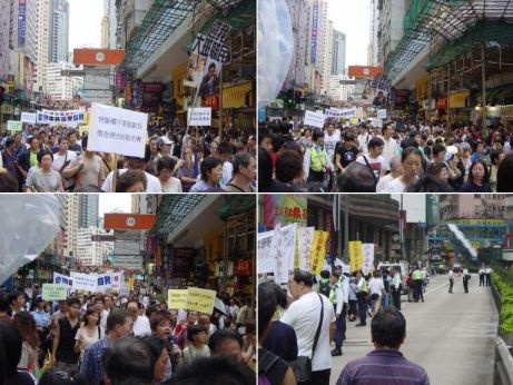 香港人はデモ行進が好きです。まあデモに興味があるのではなく、それだけ政治に関心があるということなのですが、一国二制度をPRしたい中国政府も寛容な態度を見せたいという思惑もあるので、香港人はすぐにデモという手段を用います。「デモ行進なんかしたって政治が変わるわけじゃなし!」と日本人は思いがちですが、香港では、初代香港行政長官であった董建華氏の政治手腕に疑問をもった市民50万人がデモを行い、結果的にそれが引き金になって辞任に追い込んだという経緯があるので、デモといえどなかなか侮れない存在なんです。ただし、香港のデモは、暴動もなく秩序正しいものです。上海であったような反日暴動デモのような過激な行動は見られません。これは立派なことだと思います。有名な50万人デモ以来、参加者総数が特に注目されるようになり、その数で市民の関心度を判断するという傾向が強くなりました。まあ小規模なデモは、話題にもならないという感じですね。上の画像は、先週の日曜日、銅羅湾を歩いていたときに遭遇した政府の政策に抗議するデモの様子です。暑い日中の幹線道路を封鎖してのデモ行進は本当にご苦労さまでしたが、秩序正しい姿勢を貫いて欲しいと思います。