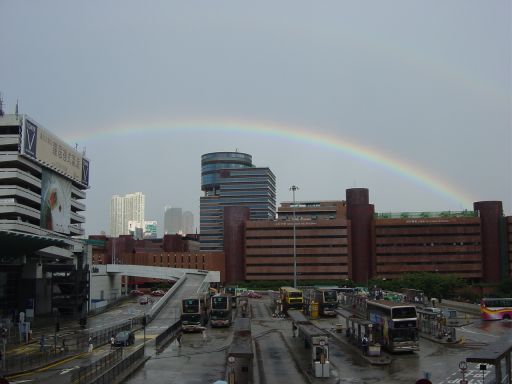 昨日の朝の事なのですが、天候が晴れているのに夕立のような「天気雨」が降っていました。会社に行くのが面倒になるような激しい雨だったのですが、しばらくして様子を見ようと窓の外を見たら、そこには何とも見事な虹が空にかかっているのを発見しました。家の窓からは、全体の半分も見られなかったのですが、外では見事なアーチ状の虹を見ることができました。考えてみると、香港で虹を見たのは初めてなような気がします。あまりの綺麗さ感動し、しばらく見とれてしまいました。通勤で道行く人も、思わず立ち止まり携帯のカメラなどで撮影し始め、中には電話で虹を報告する人もいます(笑)そうそう、今回の虹でひとつ発見がありました。皆さんは、虹の両端を見たことがありますか?アーチ状の円弧部分を見る機会は多いですが、その両端は見たことがないんじゃないでしょうか?今回は、偶然にも虹の端部を、我が家の窓から確認することが出来ました。虹って何となくぼやけた感じで始まるんですね!初めてみたので、ちょっと感動でした!それらの貴重な(?)写真も合わせて、「香港の虹」にupしておきます。よろしければ、ちょっと見てやってください。