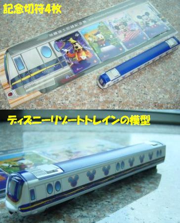9月12日の正式開園を控えた香港ディズニーランドですが、香港でも、ようやく盛り上がってきたようです。でも、実は、便乗商法の盛り上がりの方が強いかも知れません。店の前には、ディズニーキャラクターのTシャツや関連商品が並んでいます。店内にかかる音楽も、馴染みのディズニーミュージックだったりして、JUSCOとディズニーは関係ないじゃん!と思わず苦笑い。ミッキーの月餅とか見かけるとロイヤリティ払ってんのかよ?と思わず突っ込みを入れたくなります(笑)そんな香港ですが、先日の日曜日にMTR(市内地下鉄)から「ディズニーランド開園記念切符&ディズニーリゾートトレインの模型セット」が販売されました。MTRは、時々こういう記念切符セットを売り出すのですが、いずれも数量限定なので、あっという間に売切れてしまいます。なので、私もマラソンを終えた足で買いに走りました(笑)このディズニートレインは、サニーベイ駅とディズニー駅を結ぶ専用電車です。それの限定模型ですから、飛ぶように売れるのは当たり前ですよね。全区間乗車可能のチケット(大人2枚、子供2枚)+模型セットで150香港ドル(約2,200円)、ちょっと高いですが、これもお祭りの1つだと思えば安い買い物かも?知れません。いづれにしても、もう売り切れになっていますので、ご注意下さい。