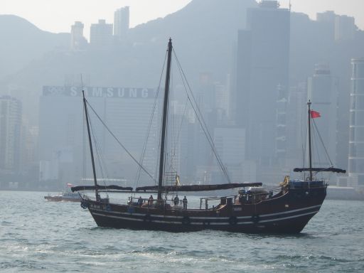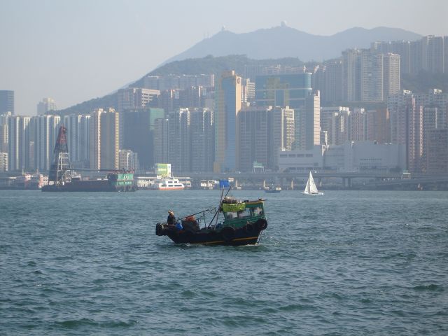 以前に「漁船」として間違って紹介した写真がありました。 昨日、写真を整理してる時に間違いに気付いたのですが、実は、この小型船、海の掃除を請け負っている作業船でした、すいません!拡大してみると、舳先のおじさんが大きな網を持っているのがわかりますよね?これで、海に浮かんでいるゴミをすくって回収して回るんです。どうして気付いたかというと、先日、所要でスターフェリーに乗った時、待ち時間で外を見たら、同じような船が、海のゴミ掃除をしていたのを見かけたからなんです。広い海なので、何だか意味が無いように見えますが、何気に作業をみていたら、あっという間にその辺りが綺麗になっていくので驚きました。ただ、大人2,3人が大きな網を持って舳先に立ち、挙動不審気に走り回る小型船は、どう見ても怪しい海賊船か拉致船にしか見えませんでした(笑)でも、こういう縁の下の力持ちみたいな存在があるからこそ、綺麗な夜景が保たれているのかも知れませんね!