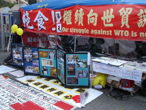 香港警察の権威を失墜させたWTO抗議暴動デモから2週間が過ぎました。既に街中に、その形跡は無く、香港人の話題にあがる事もなくなりました。そんな香港ですが、今朝になって韓国農民がハンガーストライキをしている異様なテントを見つけました。彼らの主張は、「不等に拘束されている我らの同胞を即刻釈放せよ!」です。19日の抗議デモでは、韓国農民を中心とするデモ隊が暴徒化し、その中の約1,000人が拘束されました。大多数は、即時釈放となりましたが、首謀者と見られる約10人については、保釈申請も認められず拘束されたままの状態になっています。彼らが罪を認めれば、簡略裁判で短期決着となるらしいのですが、無罪を主張しているため、裁判は長期化が懸念されています。その彼らのために、同志がハンガーストライキを行っているわけなんですね。街中の中心地に、このテントがいつまでも撤去されずにいられると思いませんが、思わぬところで見つけたWTOデモの余韻でした。