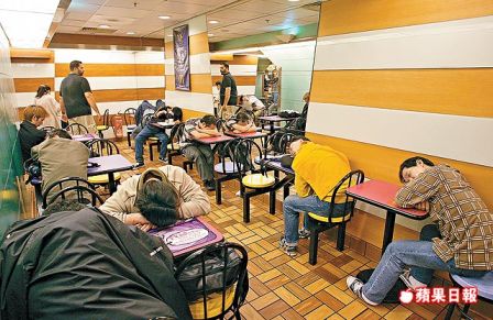 日本でもワーキングプアーの問題があり、漫喫で寝泊りする若者の増加が問題になっています。経済格差の激しい香港も例外ではなく、日本と比較しても格段に高い家賃や厳しい生活環境などが拍車をかけ、無視できない問題に発展しつつあります。アルバイト程度の収入で自活できず、2LDKに家族7,8人が住む家は窮屈で落ち着かない若者は、街中を彷徨するしかありません。でも、不夜城の香港でも、お金を使わないですごせる場所は、そう多くありません。最近、そんな彼らに格好の場所が見つかりました。「マクドナルド」です。先日から香港に展開する約200店のマックのうち、60店が24時間営業を始めました。マックで一番安い6.6香港ドル(約100円)のコーヒーを頼めば、追い出される事なく、何時間でも滞在できます。その結果…深夜から朝方にかけては、こんな状態になってしまっています。生活困窮者だけでなく、深夜の仕事が終わりタクシー代を節約したいという目的の人もいるようですが、「マック避難民(McRefugees)」と呼ばれる人々は、着実に増えているようです。マック側は、、突発事件を警戒して防犯教育や明け方の4時から6時までを閉店させる案を検討したりしているようですが、今のところ、しばらく静観して様子をみていくとのことです。こんな場所で睡眠をとっても、疲れが癒されるはずがありません。でも、例えば月収4,000香港ドル(約6万円)の彼らを助けるシステムもないのが現実です。=======================送り火星々の舟
