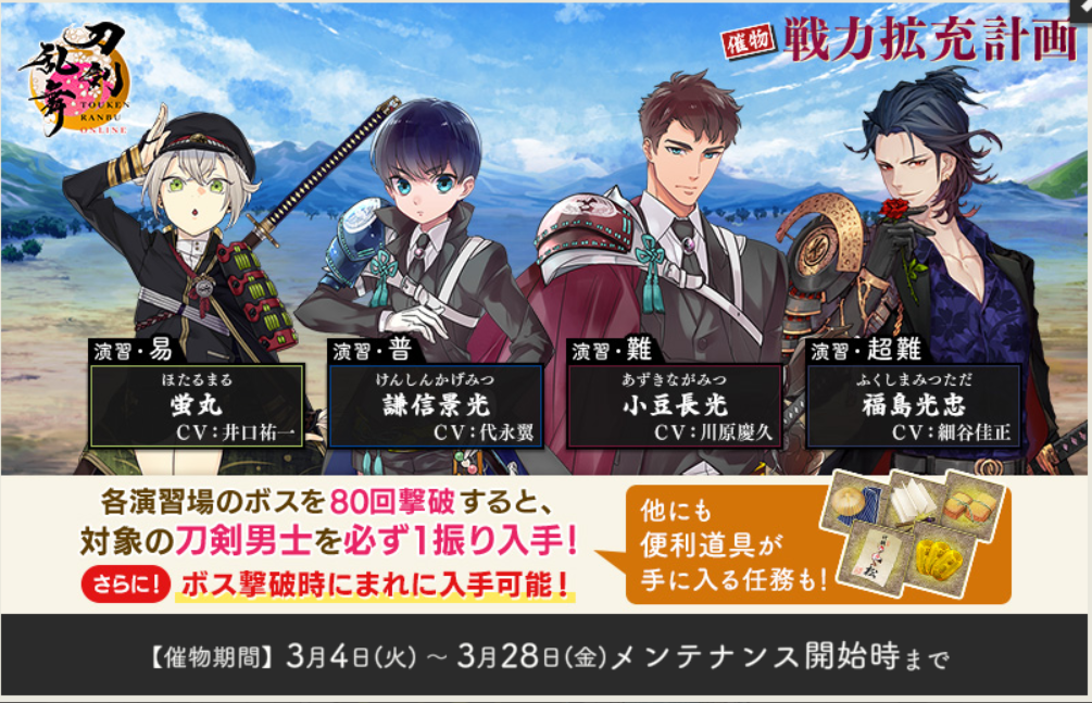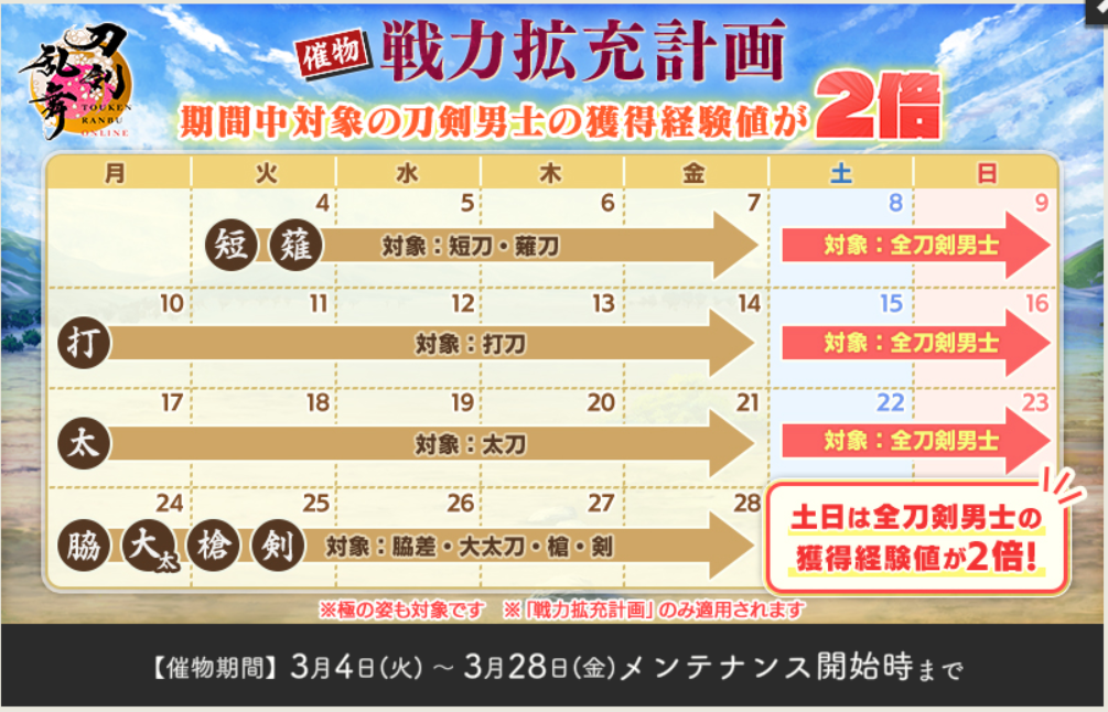 今回は経験値2倍の男士が全員で、刀種ごとに週替わりとなります。