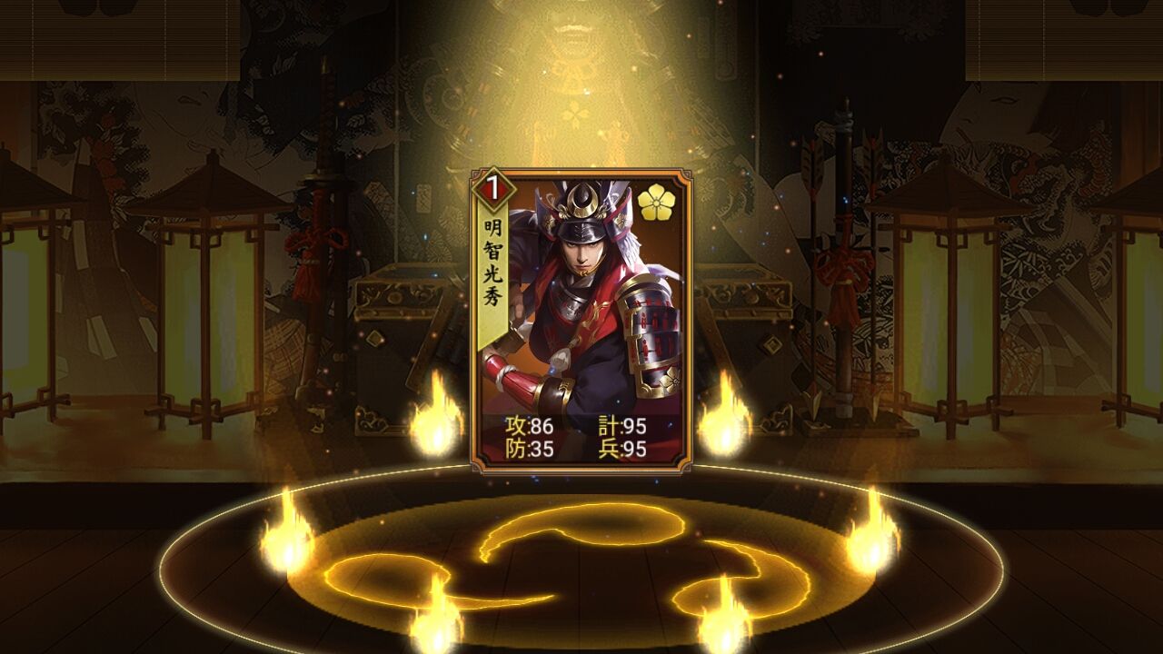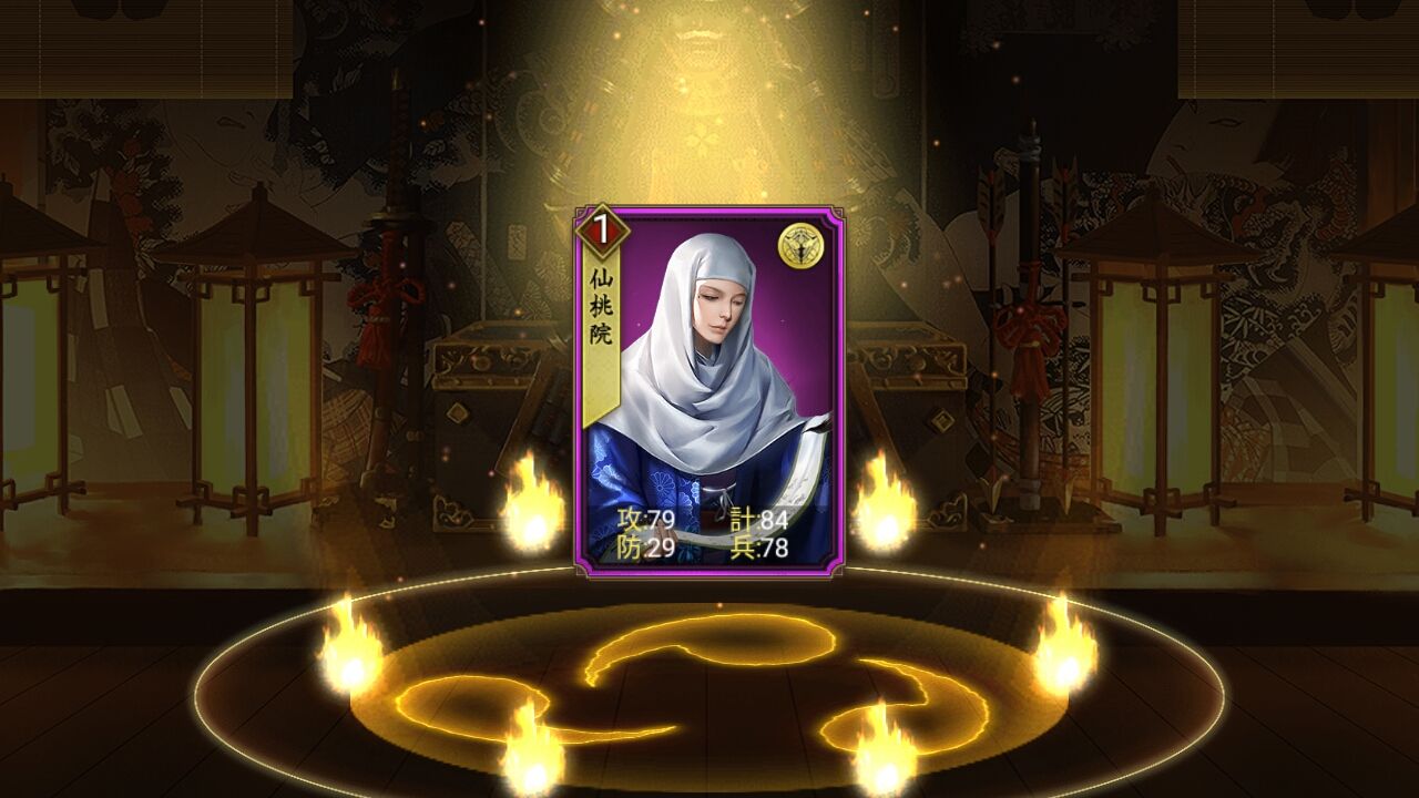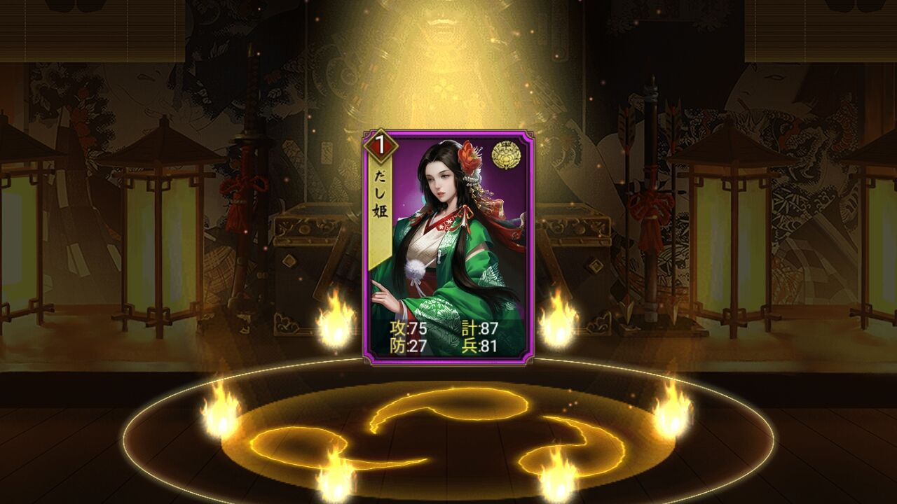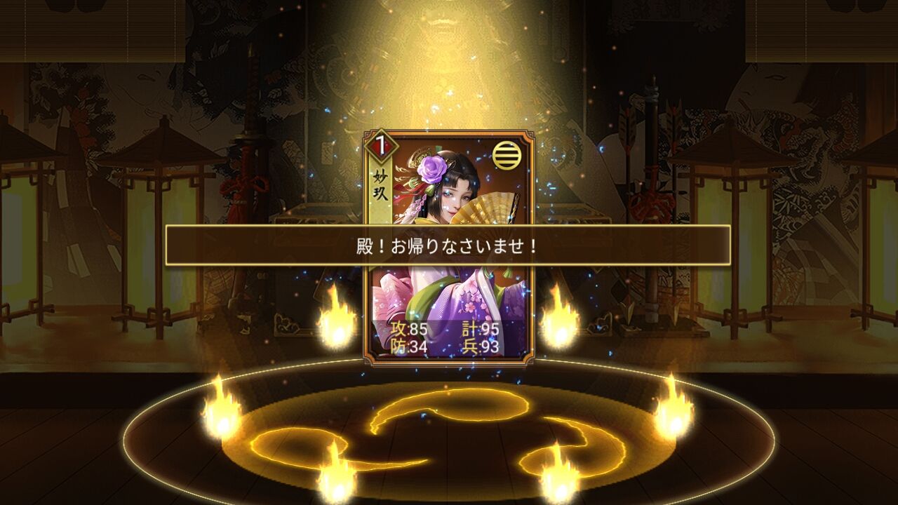 戦国布武。橙武将キタ~!妙玖登場してすぐキター!引いたときは「ん?誰だコイツ?」ってなったけど、武将紹介文を見てみると・・・ウハハ!毛利元就の奥さんでしたか。やったね~。チーム毛利の前列に、回復役が欲しかったんだあ。息子たちとも連携があるし、これは強くなりそう。これで毛利家5人揃った。最後の6人目に悩むところ。今までは妙玖さんがいなかったので、山中鹿之介と尼子勝久を入れてた。火力不足気味の毛利に攻撃役がほしいとこだが・・・。また考えよう・・・。・・・あ、織田信長と斎藤道三、星2にしました。