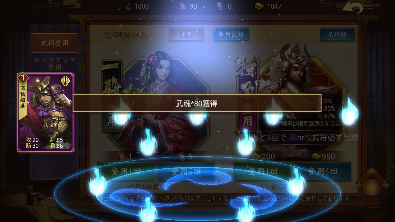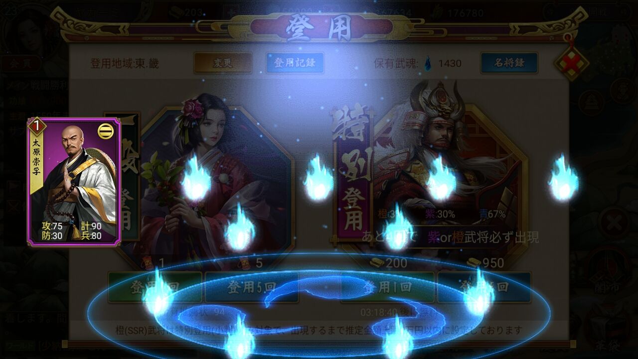 戦国布武。久しぶりの更新。一般登用で、思わぬ人物が来ました。高橋紹運get! これは強いだろうと思って能力を確認。敵全体に物理攻撃15%のダメージを与え、重傷を付与(2ターン)15%は微妙だけど、全体に重傷付与は使えるかも。同僚にも話したら、「特異前田まつ」の下位互換かな、と。なるほど、そうかも。とりあえず、チーム毛利メンバーに入れるとしよう。火力不足が解消すれば良いけどなあ・・・。毛利家の扱いが低いのが残念。。?