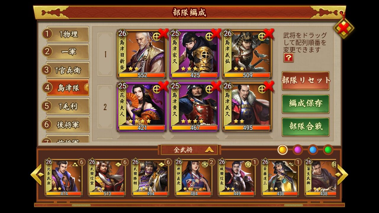 戦国布武。先日getしたじいちゃん、進化させました~!今までの運用通り、とりあえず星2までです。副将も進化させて、島津隊に配属。以下です。やった!ようやく念願の島津隊編制。なかなかこの組み合わせをしてる人はおらんやろ!そう思ってましたが・・・いました。大史で既に推奨編制を登録してる人がいた・・・。尾張のうつけさん・・・悔しい!!でも、こっちは無課金だもんね。うつけさんが無課金かどうかしらんけど・・・。まあ、同じ島津好きという事で・・・あきらめよう・・・何を?どれだけ強いか、また試そうっと。大史だと蹴散らされるけど。。。