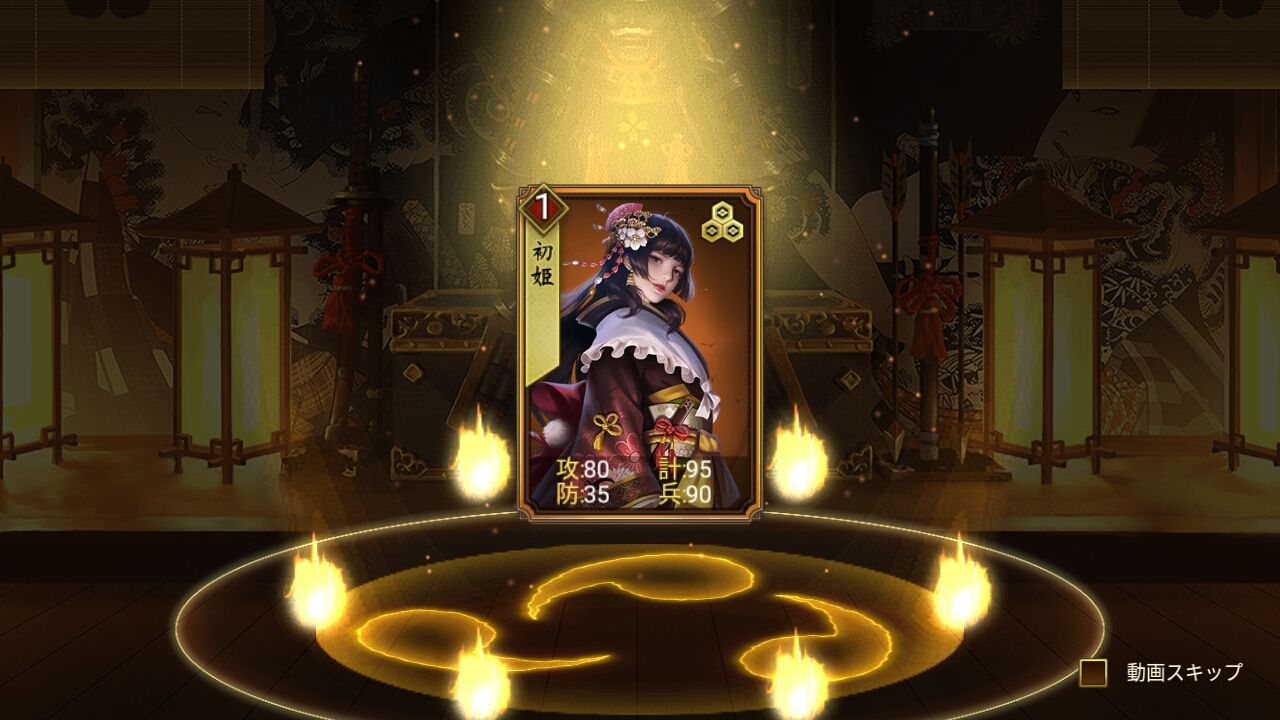 戦国布武。橙初姫getしました~!!スキルは「敵後列に45%の計略ダメージを与え、戸惑状態を付与(3ターン)」特に強い訳でもない・・・でも星1進化させると計略防御80%防御固くなる・・・?兵種は皆さん何を選択してるのか参考までに見てみるとが多い。なんでだろ・・・?連携スキルが「江姫、初姫が同時に場内にいる場合、回避+15%」「浅井長政、初姫が同時に場内にいる場合、回避+15%」おおっ!これはもしかして合計したら回避が65%になる! すげー避けまくるとか!?でも浅井長政がやられたら一気にマイナス15%になるんだよね・・・。長政 紙装甲だからなあ・・・。