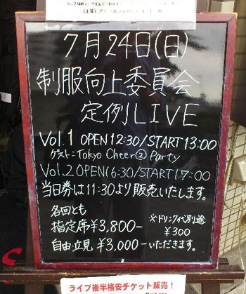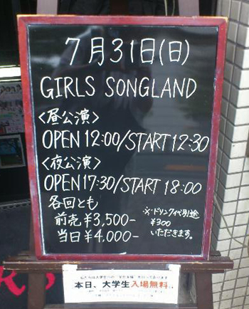 ■タイトル:GIRLS SONGLAND■日程:2011年7月31日(日)■時間:昼の部 OPEN 12:00 START 12:30 夜の部 OPEN 17:30 START 18:00■会場:初台TheDOORS(03-5350-5800)■料金:前売3,500円/当日4,000円(Drink300円)■出演:ミ★pop、clip-clop、パステル☆ジョーカー、 制服向上委員会、choice?、Survive-ZERO、Rizumu、 Prism、ぴゅあふる、チェリーブロッサム、七瀬由紀子、 相川まり(昼だけ)、HARU☆HINA(夜だけ)<昼の部>1.Prism、5人2.相川まり、メタリックシュガー所属3.choice?、3人(内田ひとみ欠席)4.Survive-ZERO、4人5.チェリーブロッサム、5人。ヘソ出しアイドル6.パステル☆ジョーカー、15人。メンバー人数>お客さん7.七瀬由紀子、ホシカゲ一員8.clip-clop、6人9.制服向上委員会 ★メンバー:小川杏奈、清水花梨、香取優花、宮野愛沙、 藤宮れいか、白石結菜。制服は白ポロシャツ。 ★自己紹介:メンバーは現在12人いるらしい? M1.「ダッ!ダッ!脱・原発の歌」 (6人) M2.「名もなき声に」 (6人) M3.「恋・青春・少女」 (優花+3人) M4.「太陽がいっぱい」 (杏奈+4人) M5.「クルクルハンカチーフ」 (杏奈+5人)10.Rizumu11.ミ★pop、5人のうち2人が男装12.ぴゅあふる、今日は3人だけど本当は5人いる■物販(SKi 優花、愛沙、れいか):CDと8/10野音の チケットとポスターとツーポラ。居ないメンバーは 脱原発のデモ行進に行っていたらしい。隠された!■終了時間(昼):17:00(4時間30分)<夜の部>1.Prism2.パステル☆ジョーカー、お客さん昼より増えた3.choice?、4人になりました4.制服向上委員会 ★メンバー:小川杏奈、清水花梨、香取優花、宮野愛沙、 藤宮れいか、白石結菜。制服は赤セーラー服。 ★自己紹介、8月と9月のライブ告知、ハッピーサーズデー 無料公開リハーサルのお知らせ。 M1.「ダッ!ダッ!脱・原発の歌」 (6人) M2.「南十字星」 (杏奈+4人) M3.「笑顔がスキッ!」 (愛沙+4人) M4.「クルクルハンカチーフ」 (杏奈+5人)5.チェリーブロッサム6.clip-clop■途中物販(SKi全員6人):CDとポスターとツーポラ(撮影は 会場外)、握手会。ライブ会場内で握手会は会話不可能。7.七瀬由紀子8.Survive-ZERO、大事なお知らせ:酒井蘭は8月で脱退!9.ぴゅあふる10.Rizumu11.HARU☆HINA12.ミ★pop、王国物語がドラクエみたいで面白かった■物販:特に目当てなし■終了時間(夜):22:15(4時間15分)■感想など 今日は○んのさんのためのライブ。ありがとうございました!
