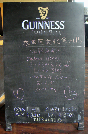 ■タイトル:『太田区文化会 VOL.15』■日程:2011年7月18日(月・祝)■時間:開場11:30/開演11:50(14:45終了予定) 11:45~オープニング 14:00~物販 ※出演者の「写真撮影タイム」(約1分)を予定。■会場:Shibuya O-nest■料金: ・一般前売3,000円/当日3,500円(※ドリンク別) ・学生前売2,000円/当日2,500円(※ドリンク別) ※女性先着30人無料招待■出演:佐藤あずさ/Sweet Honey/ろいやるみるくてぃ♪/ Little Step/パステル☆ジョーカー/あいらぼ/メグリアイ★司会:平野恵里佳(てーな)1.佐藤あずさ、笛吹きアイドル2.Sweet Honey、2人ユニット3.ろいやるみるくてぃ♪、5人。元ぱるふぇ+2人ですね4. Little Step、7人ユニット。本当は9人いる5.パステル☆ジョーカー、今日は7人の選抜メンバー6.あいらぼ、5人ユニット(制服)7.メグリアイ 6人(冨永杏里、廣岡麗華、和地つかさ、齋藤愛、 岡崎みさと、石田絵里子)。和地つかさ好きすぎます。■終了時間:14:30(2時間40分)■感想など 以前から気になっていた、メグリアイの和地つかさ ちゃん!かわいすぎて幸せでした。