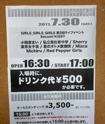 ■タイトル:GIRLS_GIRLS_GIRLS 第2回ライブイベント Second Kiss!!■日程:2011年7月30日(土)■時間:開場16:30/開演17:00■会場:Shibuya duo MUSIC EXCHANGE■料金:前売3,000円/当日3,500円(ドリンク代別途必要)■FM-FUJI主催■出演:東京女子流/私立恵比寿中学/Sherry/星のオトメ歌劇団 小桃音まい/Mizca/Michiru/Red Pepper Girls/1.小桃音まい2.Red Pepper Girls、韓国姉妹3.Sherry、3人のお姉さん4.Michiru、元AKBチームA「星野みちる」歌すごくうまい5.Mizca、ダンサーが2人つき6.私立恵比寿中学、10人。子供に食いつき良すぎ,会場大騒ぎwww7.東京女子流、頑張って最前2列目で見た!今まで最接近!!8.星のオトメ歌劇団、7人。と、月のオッサン(ry...■物販:見学だけ。東京女子流はスタッフのCD予約のみ。■終了時間:21:30(4時間30分)■感想など エビ中が一番会場が盛り上がった!ティッシュ投げていた。 歌は良く聞くとなんだかおかしい?。女子流は、前に出て 2列目キープして良く見えた。衣装はキラリ☆、やっぱり 「鼓動の秘密」は凄く良くできいると思う。クオリティは 女子流がピカイチなんだけれど、ヲタ的には、エビ中が 最もオイシイかと思います。エビ中を応援するには、相当 の体力が必要ですが。(^_^;)<私立恵比寿中学、星名美怜>