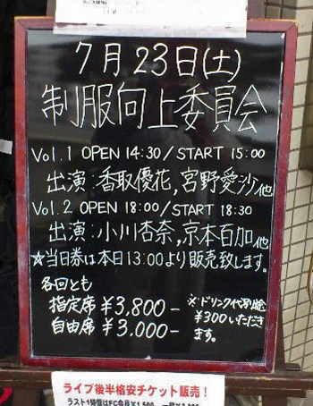 いや。前日に言われても・・・。行けません。■2011年7月29日 制服向上委員会 急遽出演決定!! “アイドルカーニバルVol.2”<タイトル>“アイドルカーニバルVol.2”<日時>7月29日(金) OPEN 17:30 START 18:00<出演>アイドルカレッジ、JK21、凸姫@音 Tokyo Cheer2 Party、メグリアイ、制服向上委員会 ※こちらの公演に京本百加の出演はございません<於>初台TheDOORS(03-5350-5800) ※京王新線「初台駅」甲州街道北口下車、徒歩30秒