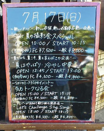 ●7月17日(日) 10:00- SKiイベント@初台TheDOORS/SKi's 夏の撮影会スペシャル 12:45- SKiイベント@初台TheDOORS/夏はやっぱり・冷やし中華 15:00- SKiイベント@初台TheDOORS/気もトークなる会 18:00- SKiイベント@初台TheDOORS/Let's Challenge Sing Song●7月18日(月祝) 11:30- メグリアイ@渋谷O-nest 18:00- 木ノ下ゆり@国分寺クラスタ