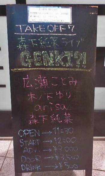 ■タイトル:森下純菜「GENKI!? Vol.47」■日程:2011年7月30日(土)■時間:11:30 open / 12:00 start■会場:東京・渋谷テイクオフセブン■料金:前売3,000円/当日3,500円(Drink500円別)■出演:森下純菜、木ノ下ゆり、広瀬ことみ、arisa■主催:スリートゥリー1.広瀬ことみ2.木ノ下ゆり 「夢の中のロンド」、「青い涙」(志賀真理子)、 「GT夏少年」(レモンエンジェル)、「夢見るマー メイド」。麦わら帽子の夏の服装だったので、 GT夏少年フラグ立った!と思ったら、キタ(゚∀゚) 来週と再来週の「さしこのくせに」TV出演。3.arisa、2月の節分以来のライブ4.森下純菜、夏の歌9曲 今度のアルバムはSKi橋本美香が作った曲あり、 CD発売イベントには橋本も出演する予定らしい。■物販:ゆりりん歌詞本、こっとん写真■終了時間:14:30(2時間30分)■感想など ベルマーレ氏を久しぶりに見た!(^_^;)