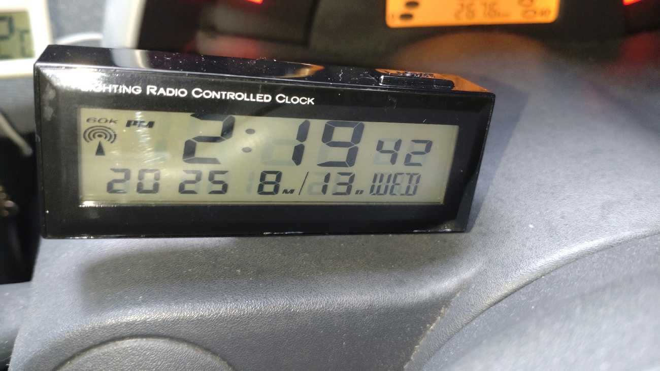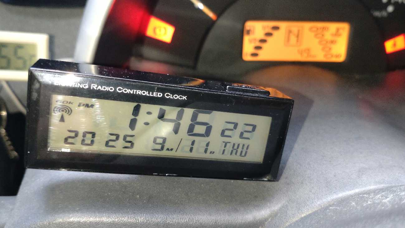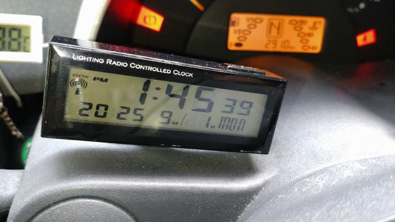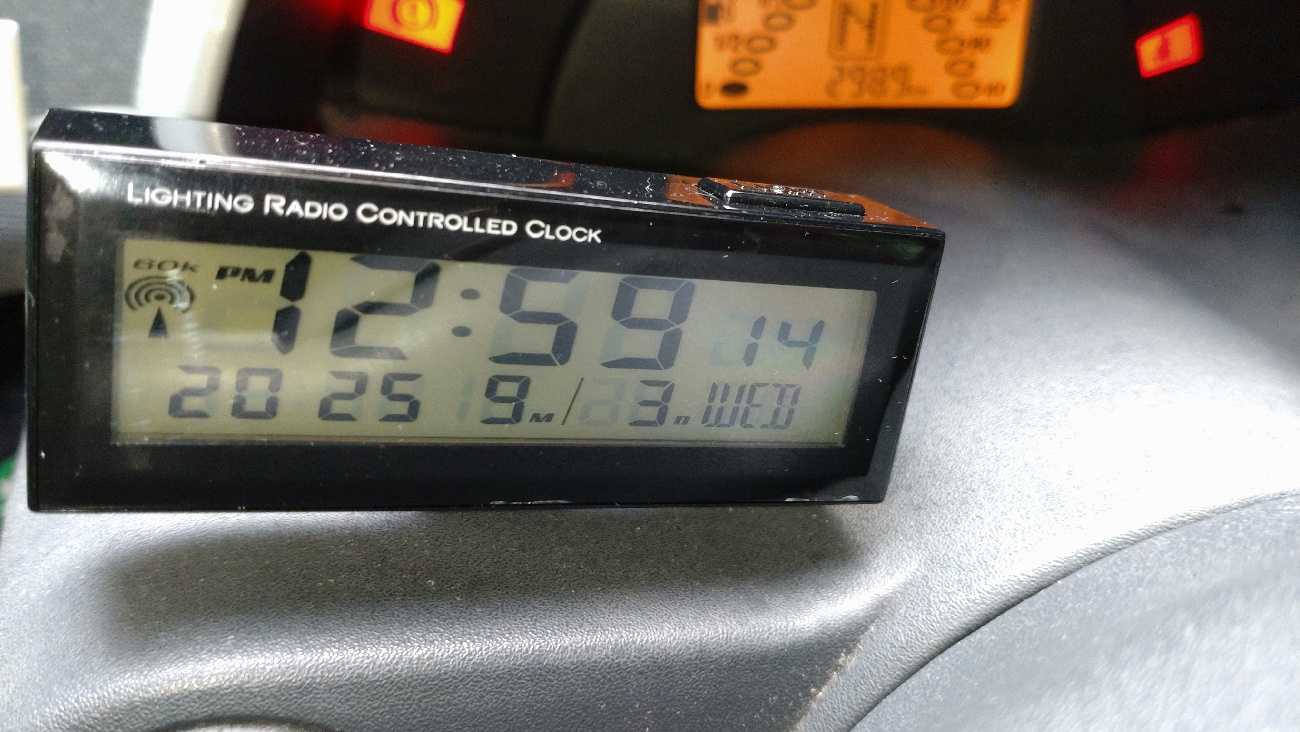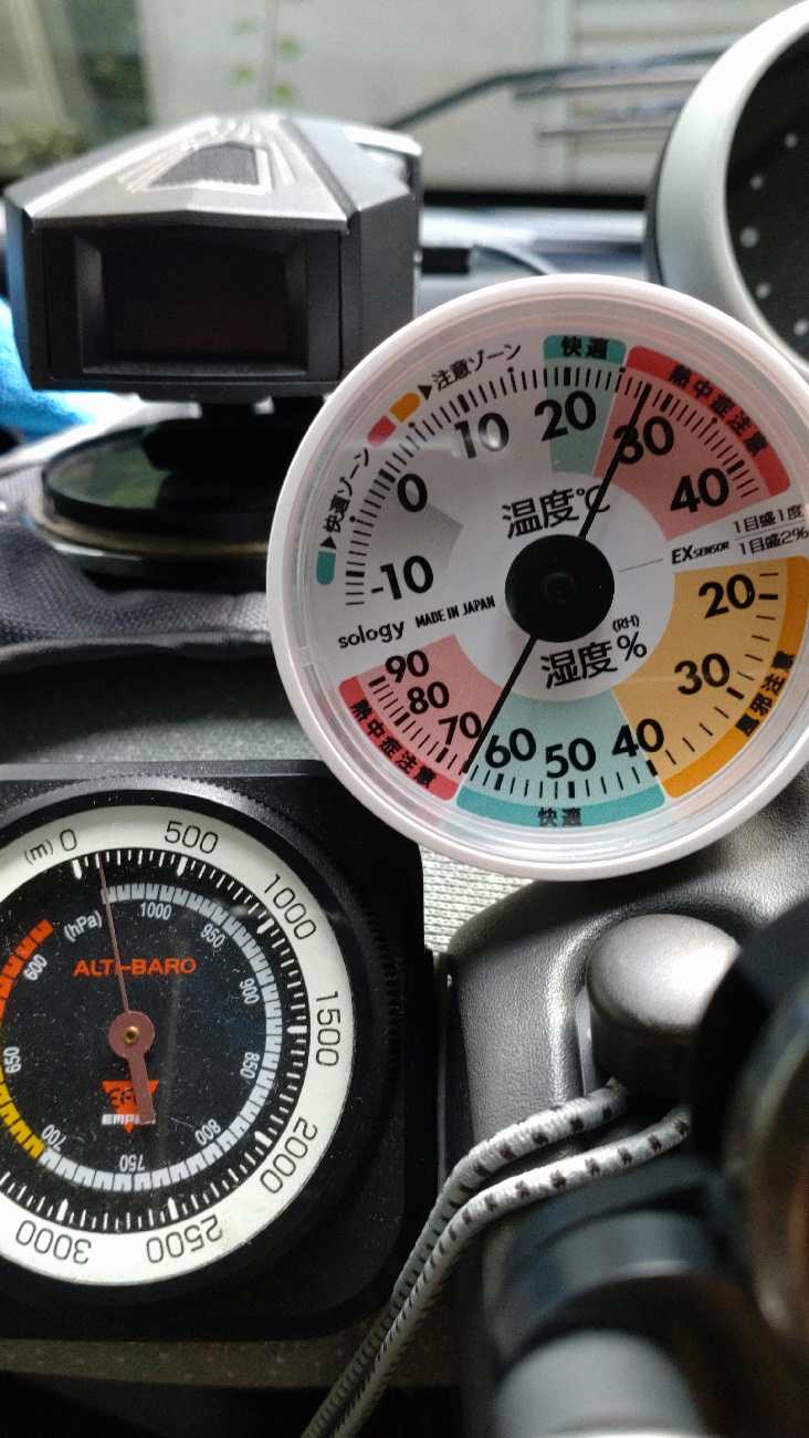 先日カキコした…、を取り付けてみようと思います。車内の湿度って、どんな感じなんだろう…。コレから寒くなるにつれ、気になるときがあります。スマ車あるあるのエアコン使用時の突然の激曇り発生…。スマ車のエアコンって、湿度を監視していないから寒いとき除湿のつもりでエアコン入れてると、突然フロントガラスが曇り始めます。コンプレッサーを切って風だけを回すから、除湿暖房の暖熱で瞬時に曇ります。あの結露しているときの車内の湿度ってどれくらいなんだろう……。そんなのを検証してみようかと……。遮光物を全てかたづけて…、イグニッション。デジタルの車内温度計は…、29.1℃ですねぇ…、で、温湿度計は、25℃です。ま、コレは室内から持ち込んだばかりのアナログ計なので、タイムラグの範囲だと思います。さて、コレを何処に取り付けるかですけど……。ちょっとデカくて…、何処もシックリ来ません。丸の大きさはともかく、厚みが難儀ですぅ…。ん~、ガムテープの芯みたい……。一応ここに取り付けてみようかな……、ここなら、エアコンの吹き出し口との関係も見れそうだし…。四角いデジタル表示は、エアコンの吹き出し口内部の温度をモニターしています。一先ず、3Mの両面で…、くっつけてみるよ。吹き出し温度が、14.3℃で、車内温度は25℃・湿度35%と言う感じですね。温湿度計が正確に刻み始めるにはもう少し時間がかかるかと…。取り敢えず、取付場所に不具合無いかチェックの試運転もかめて、いつもの野暮用で出掛けます。スクールゾーンはゆるゆると。高速の側道で、ギャン踏みして…。田舎の一本道をぶっ飛ばし…、丘を一気に駆け登り。いつものヤマトに到着。今日の荷物は…、ワイパーブレードです。比較的新しい顔馴染みさんから、受け取りました。525ミリを2本です。でね、どこ製なんだろう…。へんてこりんな漢字は無いから、アノ国製では無さそうだけど…。取り敢えず、備えあれば憂い無し、のバックアップ装備品です。ええ、取り敢えずまだ交換はしません。丘を駆け戻ってます。高速の側道をカッ飛ばしたかったけど…、前に追い着きそうです……。はい、白いのが前を走ってます。2:33無事帰投…。で、これと言って不都合はありません。そこに有っても、気にも成りません。下から、水色の矢印はエアコンの吹き出し温度で、14.3℃です。つぎ、青矢は車内湿度が29%くらい。赤い矢印は、30℃で…、デジタル温度計とほぼシンクロしています。つう事は…、信用して良いのとちゃうかな。湿度に関しても、まぁ、こんな物なのでしょう。(湿度計だけが狂ってると言うのは考え難いし)寒い日、暑い日、雨の日…、気が付いたらデーターを取ってみようと思います。さてさて…、本日の走行距離は、猿でも解る6kmでした。_/Smart _/_/_/_/_/_/_/_/_/_/_/_/_/_/ぴゅあらいと_/_/_/_/_/_/_/_/_/_/_/_/450K_/_/