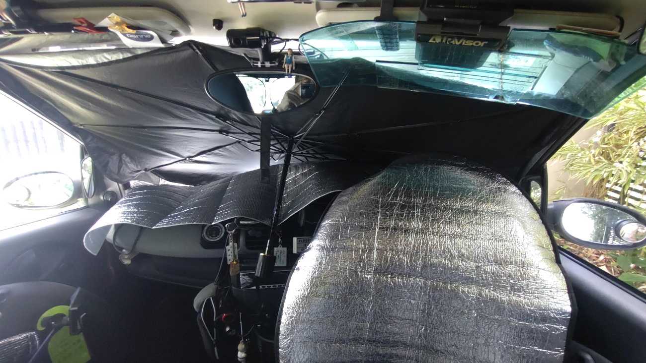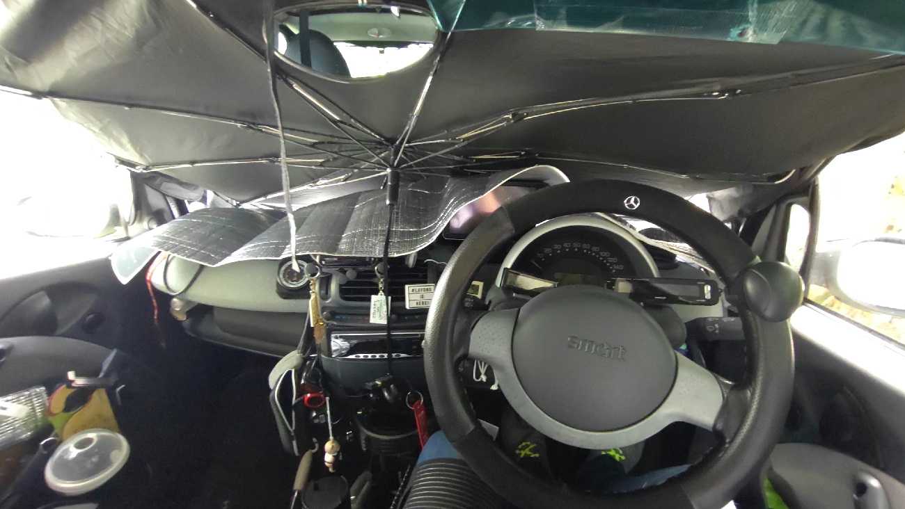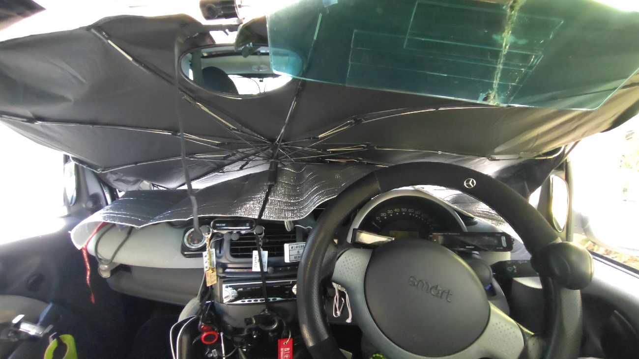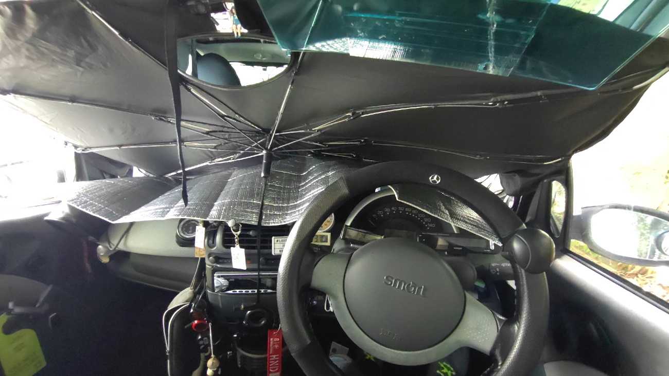 先日こんな物を手に入れた…。これ、紫外線と赤外線をカットするフイルムなんだけど…。ん~、効果の程は……。ダメ元で貼ってみることにする。ラッピングフイルムよりずっと堅くて、ちょっと取り扱いに手こずる。赤矢が本フイルムで青矢が保護フイルムです。貼るときは、保護フイルムを剥がしつつ本フイルムを転写する感じで貼っていくのだけど…。先ず運転席側に貼ってみたけど…、上手く貼れない。想像以上にフイルムが堅くて、ガラスの曲面に馴染んでくれない。青矢は空気が入った部分です。黄矢の部分は、素のガラス面です。通常のサングラスフイルムなら、柔らかくて粘着力があるのでヘラで空気は追い出せます。だけど、このフイルムは堅くてブスチックの薄い板みたい…。しかも、貼ったり剥がしたりする物らしくて粘着力は弱めです。でね、スマートの窓ガラスはただの曲面ではありません。まるで、球体の一部を切り出した感じの、上下に丸く前後にも丸いです。当然、堅いフィルムは“R”に馴染まなくて気泡追い出しで強く貼ろうとすると、シワになりました…。ん~、取り敢えず助手席側は残して出発する。イグニッション。天気はどんより。でも、雨の匂いはしません。高速の側道をカッ飛ばし…。田舎の一本道をぶっ飛ばし…。お馴染みのヤマトに到着。この時の荷物は、足袋スニーカーでした。受け取って帰る途中で…、いつものドラッグストアへ。ここで、助手席側にもフイルムを貼ります。赤矢が本フイルム、青矢が保護フイルムです。添付のヘラを使って…、フイルムの中心を窓の上端から、下方向へ1本張り下ろし…、次に中心線の中心から葉っぱの葉脈のように、上下左右に貼り卸します。細かく何度も気泡を追い出せば、ソレでOKなんですが……。フイルムが堅すぎて、どうしても(青矢)皺に……。真冬に無理矢理フイルム貼りをして居るみたい………。ちなみに、この時の気温は30度超えてます。ん~、コレはこんな物なんかなぁ……。なんか不本意なんだけど……。皺が気に成って、ヘラでコシコシすると、パリパリと音がする。取り敢えず、これで様子を見る。して、この今迄のは…、復活も有り得るので…、車内にて保存する事にした。並木道を駆け登り…、スクールゾーンをゆるゆると…、家に着いて、カーゲートを開けるために車外に出たら…、一瞬で眼鏡が白くなったよ……。登ってくる途中で、我が家方向見たら雲の中だったもんなぁ……。3時半前に…、到着。本日の走行距離は…、9.2kmでした…。さて、次の話もフイルムを貼った話です。で、そのフイルムというのが、コレ……、青いテープは、仮止め用の物です。本フイルムとは関係有りません。半分だけ、粘着部分の保護フイルムを剥がしてます。で、このフイルムは何かと言うと…、HUD用のミラーフイルムです。ここに、こんな感じで貼ろうと思います。運転席からの位置関係は、こんな感じ。未だ、ミラー面の保護フイルムを付けたままです。ガラスに貼り付く粘着面をコシコシして…、固定しました。位置がズレて見えると思いますが、着座位置から見ると…、芯に来てますよ。それに、多少の位置調整は…、光源がポン置きなので,細かい……、調整は後から出来ます。運転姿勢で、スマホのレンズを眉間に着けて撮ってみました。運転姿勢で、こんな感じで見えています。OBD2コンセントからのデーターじゃ無いので、なんか物足りないけど…。(2はギリシャ文字の2)21年前はOBD2は存在してなかったので、仕方の無い事だけど………。因みにだけど、このフイルムの透過率が解りません。車検に通らなければ剥がされちゃうけど……。その時は、またフイルムを買うから……。_/Smart _/_/_/_/_/_/_/_/_/_/_/_/_/_/ぴゅあらいと_/_/_/_/_/_/_/_/_/_/_/_/450K_/_/