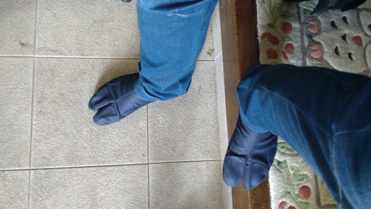 先日来、歩き方改革のために地下足袋を履いている話をカキコしているが、今迄のはホントに地下足袋でして…。ただ、ホンマもんの地下足袋とちょっと違うのが、ヒールが在ると言う事です。ソレが…、これ、ホンマもんの地下足袋は、足袋にゴムの靴裏を貼った(塗った)だけなのですが、この地下足袋は踵が高く成っています。その分履きやすいのですが、足裏は全体的に薄いので路面の白線の段差も、小石を踏んだのも判ります。何より、見た目“足袋”です。して、ちょっとお出掛け用に…、今度は、スニーカータイプに…、しました。それが、コレです……、横から見るとバスケットシューズだけど…、ほらっ、ちゃんと親指が在る。でね、この(赤矢)部分で…、地面を感じ取れます。ここ、親指の付け根に当たります。普通の足を差し込んでいるだけのスニーカータイプと比べると、この地下足袋タイプは地面を感じ親指で踏み出す感じが凄く良い…。では、今からこの地下足袋スニーカーをお洒落にバージョンアップします。(だって、他人と同じは嫌だ、あたしゃオリジナリティを持っていたい。)何をするのかと言うと…、これを使います。何だコレ?と思うでしょ。実は、これ、靴紐なんです。新品の靴紐を取り去り、コレに替えます。ちなみに、コレ…、コーユーヤツです。靴紐なのに、何故か4~5穴用と6~7穴用があります。●穴と言うのは、靴紐を通す穴のことですね。因みに、15年位前の新商品です。今回探してみたら、未だ売ってた…、良かった。で、安心して下さい…、日本製ですよ。※地下足袋靴は岡山産です。このゴム靴紐、ピークを過ぎた商品なのかなぁ…、だってバク売れ時代は劣悪CK製品のオンパレードでしたから…。ゴムがピロルし、瘤の部分は小さいし…。沢山の人が騙されていたと思う…。では、先ず、オリジナル紐を解します。次に、ゴム紐を左右均等バランスで通します。ココで“瘤”の意味が解りましたでしょうか?この瘤の位置とゴムの弾性で、靴紐が締まります。始めは締まり具合が判らないので、感覚で編み込みました。では、ここで“タビックス”の登場です。足袋&ソックスで、タビックスっす。※タビックスは、多分登録商標です。で、履いて見ました。ありゃ……。やってもうた…。通す場所を間違えたねぇ……。※タンと呼ばれる足の甲の部分をカバーしている所にある、靴紐を通す部分…、コレの名称が判らん。ここ、もう一段上だった……。して、解し直して…、今度は突っ張ってないよ。掃き直して…、ゴムのテンションの微調整です。因みにですが、靴紐通しの一番上は態と使いません。履きやすく、そして、脱ぎやすくするためです。脱着しやすくと言っても、某スニーカーのように立ったまま履いたり脱いだりは出来ません。履くときは、両手が必要ですし脱ぐときも躰を支えてないと危ないです。つまり、しっかりホールドされた履き方だという事になります。それに、瘻付きゴム紐は、普通の靴紐と違って解して結んでと言う使い方は出来ません。あの靴、履きやすく脱ぎやすいのが売りだけど…、ソレって脱げやすいって事とちゃうん?有事の祭、すっぽ抜けたりはしないのだろうか……。何れにしろ、アレは地下足袋タイプでは無いので比較対象は出来ませんけど……。左右共に、仕上げました。暫く雨の日が続くそうなので、実戦デビューは出来ず仕舞いですけど…。ところで、赤矢の部分凹んでいるの解りますぅ?(写真用に踵で履いています)実は、我がアンヨ実測では26~26.5なのですが、この足袋シューズは27.5を買ってます。なんでかと言うと、青矢の部分が実測サイズだととてもキツイのです。俗に言う、だんびろ甲高っすね。なので、通常の靴サイズより一廻り大きな物を履くことになります。コレ難儀じゃあ………。通常使用において、爪先で履く(草鞋とかもです)ので大きなサイズでも平気です。蛇足ですが、ナイキシューズは甲の部分をピッタリホールドするので、大変重宝しております。(ナイキは“だんびろ甲高”の所為で+3センチサイズです。)はてさて、荒天が回復したら、足袋スニーカーデビューしたいと思います。_/Smart _/_/_/_/_/_/_/_/_/_/_/_/_/_/ぴゅあらいと_/_/_/_/_/_/_/_/_/_/_/_/450K_/_/