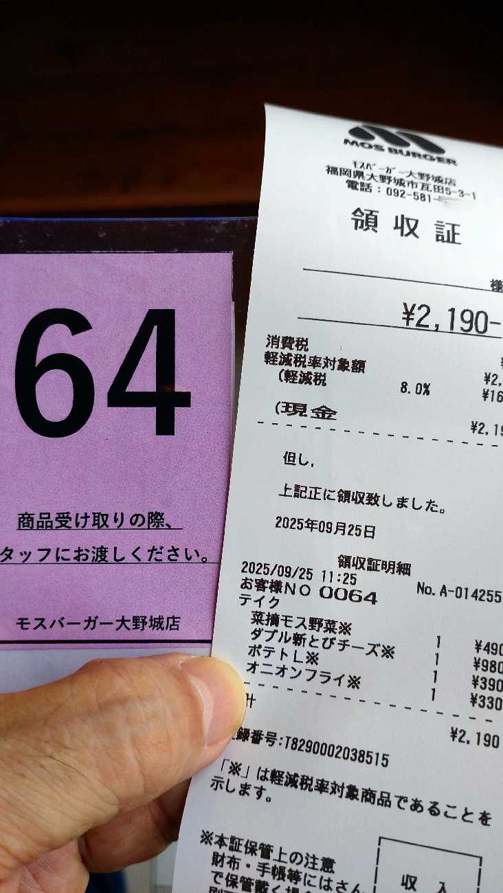 9月25日の話です。この日は、メッチャ早起きしました。と、言いましても…、一般ピープルの方達のとっては決して早くないと思いますけど…。なにせ、4時頃に寝て7時半に起きたので……。かなり気合いを入れて行動しています。で、色々と雑事をこなして、眠くなるのを我慢して待機……、すると9時50分過ぎ…、住職登場…。ん~、9時半頃だと思ってた…。結果、1時間堪えたぁぁぁぁ…。ま、事前に時間を約束してた訳じゃ無いけど……。(事前の予告葉書では“午前中”とだけ…、前回はそれまでより1時間早かった。)因みに、監視カメラのタイムスタンプが進んでる…。ホントは9:52です。で、読経して、終わって…、田川(福岡県田川市)の話をして……、ドレン水の跡を残して帰られました。田川も彼岸花の白は見ないそうです。どこも赤ばかりなんだって…。気温が高い日が続くと、そー成っちゃうのかもね。線香が消えるまでの時間で、後片付けを…。住職用の座布団片付けたり、ワチャワチャと汗掻いて…、火の用心をして出掛けます。今日は、かなり奥まで進めて駐めてました…、住職の車が入るからね。2台目は天蓋から半分以上出るけど、SUVが2台は駐まれるスペースはあるよ。さて、イグニッション…。“21”はメンテの警告だよ。気にしてないけど、本来のスパナ2個マークじゃ無いからね。車検までは13ヶ月以上あるし…。11時を回りました。今から、メシに行くよ。今日の気温は…、内も外も涼しめだね。で、エンジンの掛かりがモタ付いた…。バッテリー電圧はOKだけど、スタミナがなくなっているのだと思う…。3年経つからね…。そろそろだと思う…。今年の冬は、ダメだろうね。空は、高曇り。日射しは柔らかいね。暦の上では秋だからね。スクールゾーンはゆるゆると…。並木道も、ゆるゆると…。左側に小学校があるからね。だらだら県道を北上して…、都市高の下を潜って…、田舎の都会村へ…、白クロ号は進んでます。して、目的地に到着…。最近想い出したように食べたくなった、モスです。そー言えば、モスって昔は、赤と白と緑のモスがあったけど…。最近は、色の分類って無いみたいだね。昔は直営が赤で、オーナー店が白で、ハンバーガーレストランが緑だったと記憶してるけど。“匠・たくみ”って言うのもあった…。(←コレが当時の緑?)日本発祥のモスは、好きです。オーダーを受けて作ってるからね。“回転重視”して無い所が、日本企業らしいと思うけど…。何より、作り置きをしないのが素晴らしく良い。久々だねぇ…。モスに来るのは、何年ぶりだろう…。車の中で、厳選したオーダーを再確認。店内に入り、持って帰る事とオーダー内容を宣言。で、セルフレジじゃん…。でさ、いつからだっけ……、現金を直接受け取らなくなったの…。このレジって、中で現金の消毒でもして居るのだろうか?????レシートと番号札を持って待ちます。オーダーを通したのが11:25で…、どっかの“赤地に黄色いM”とは大違いで、ココは待たされます。うん…、目の前で作ってるからね。旨い物を待つのは平気です。大した事無い物を並んで待つのは嫌いですが……。で、番号を呼ばれて受け取ります。下の写真のプロパティは11:32でした。ここで、感心しました。オーダーミスじゃ無いかと思って、思わずその場で確認しました。袋が2つなんです。あの“赤地に黄色いM”と大違い。凄いっ、ここはちゃんとしてるわぁ……。温かい物(Wバーガー・ポテト等)と冷たい物(菜摘)を…、ちゃんと分けてくれてました。うちの近所の“赤地に黄色いM”はシェイクと熱々のバーガーを一緒の袋に入れます。もぉぉぉぉぉっ、バカじゃ無いの…。シェイクが溶けるし、バーガーが冷めるやん…。優しい心遣いがマニュアル化されているモスは、素晴らしいと思います。そのご厚意に与り、2つに分けて持ち帰ります。あ、もう一箇所寄り道するけどね。この話、続く。_/Smart _/_/_/_/_/_/_/_/_/_/_/_/_/_/ぴゅあらいと_/_/_/_/_/_/_/_/_/_/_/_/450K_/_/