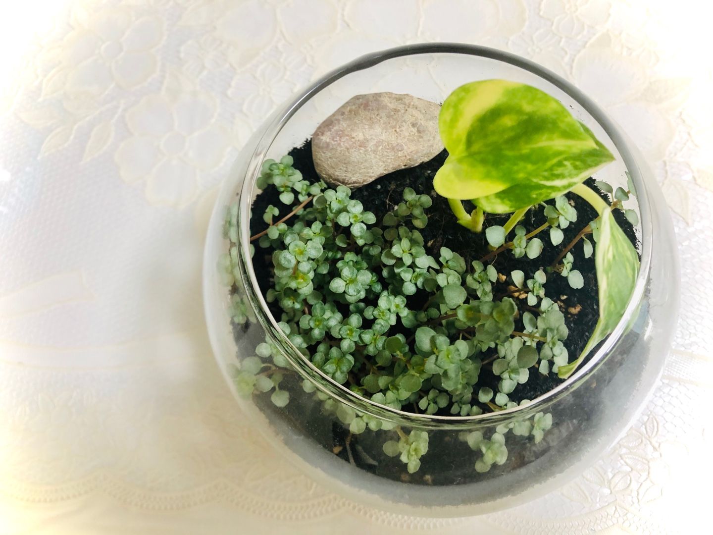 観葉植物をテラリウム風にアレンジしてみました。色んな石や土を順番に入れて層を作るのがポイントです。土から彩りを楽しめるんですね。最初、苔リウムに興味があって調べていくうちにたどり着いたのが、観葉植物のテラリウム。苔が手に入らず、テラリウムなら家にあるもので作れそうだな~と思い今回はうちに余っていたモノを活用して作ってみました!<使用した材料>①ハイドロボール ②多肉植物用の土③金魚の石(庭にあるきれいな石でもOK)④園芸用土⑤もともと育てていた観葉植物⑥100均のガラス容器最後にその辺で拾ってきた石をポンとのせてみる。それっぽくなったかな??個人的にはここにトトロのフィギュアを置きたい。。もっと石や植物に凝って、カラフルにしても可愛くなりそうです。貝殻やフィギュアなど小物遣いを工夫すればお洒落になりますね。よりアートさが加わるテラリウム。お洒落な鉢に飾ってみたいです。また何か可愛い素材を見つけたら、飾り付けしたいな。観葉植物のアレンジの幅が広がって、楽しかったです♪Coco