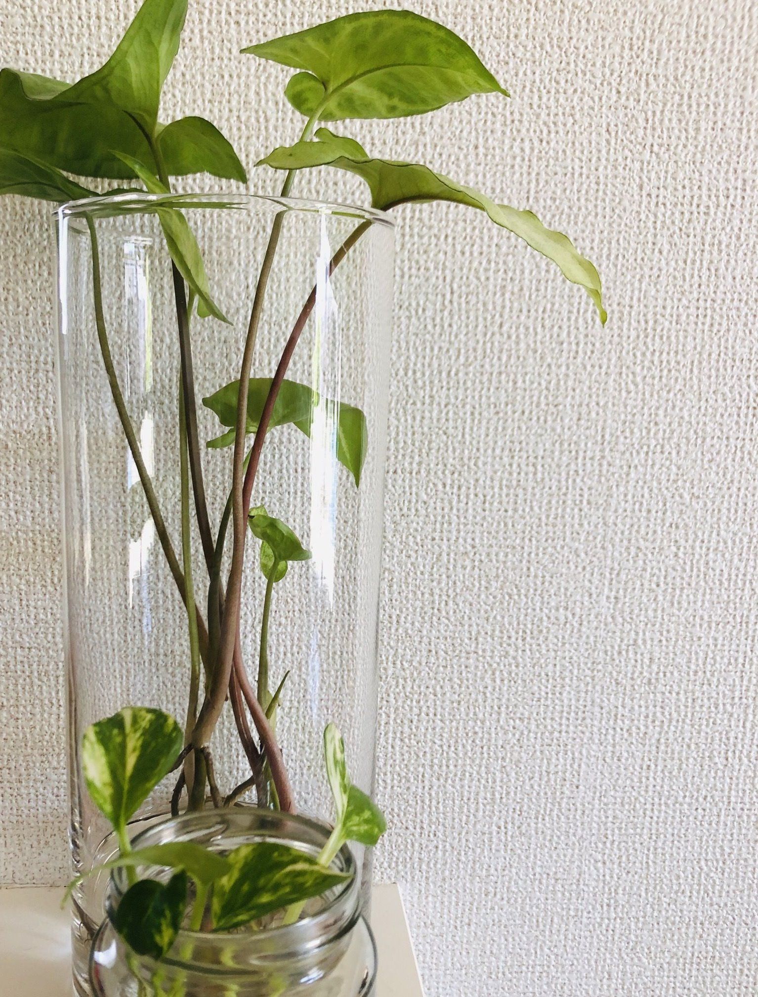 こんにちは、Cocoです去年の夏、とある知人が育てていた観葉植物をいただきました。「水に差しておくだけでいいよ~!」と。以前住んでいた街から大移動してきたというのに本当にその通りで 枯れることなくずっとピンピンしてます。むしろ土に入れるより調子がよさそうなんですね。最近少し液肥を与えたら 新しい葉がどんどん出てきています。室内でおしゃれに飾れるし、管理が水の入れ替えくらいなので水耕栽培っていいな~!と思えたきっかけでした。狭いスペースできれいに花を植えていたり「増やしすぎちゃったし観葉植物あげるよ。」なんて、洒落ていて素敵な知人です。こんな風に受け継いでいけるとは、植物の力ってすごいと感心していまいました。おかげさまで 生き生きとした緑鮮やかな葉がリビングを明るくしてくれています。みなさんもぜひ 観葉植物を飾ってみてくださいね。Coco