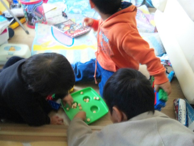 いつも読んでいただきありがとうございます。★ランキングに参加してます。★励みになりますので、ポチッとお願いします。 ↓にほんブログ村今日はとても天気がよかったですね。でも、強風で黄砂がすごかった・・・。このおかげで、花粉症のお母ちゃんは、朝から鼻水とくしゃみが出ております今日はお父ちゃんが仕事だった為、お母ちゃんと3人の子供たちは、外にも出ず、お家でまったりしました。お昼から眠たくなったのか3号がグズグズになり、寝かせる為に、一緒に横になったら…お母ちゃんすぐに撃沈お母ちゃん、3号と2時間くらいお昼寝しちゃいましたその間、1号と2号は仲良くブロックで遊んでたみたいです。ブロックが散乱してましたから…(笑)お昼寝からいち早く目覚めた3号が、お菓子を持ってきて開けろ~っと、お母ちゃんにお菓子を突き付けてきました。しかし、お母ちゃんはまだ、目が覚めておらず…。お布団にくるまって半寝しておりました。開けろ~っとばかりに耳元で叫んでウルサイので、封だけ開けてあげると、嬉しそうに去って行った3号でした。でも、そこから2、3分ぐらい経ったでしょうか…お母ちゃん完璧に目が覚めました。で、起きると3人仲良くお菓子を食べてました。(さっき封を開けたお菓子を仲良く食べる三兄弟)よく見ると、ブロックの蓋をお皿がわりにしてるじゃないですかちゃんと穴にお菓子が入ってて…笑っちゃったそして、起き上がって隣の部屋に行くと、何じゃこりゃ~~~!!!!おもちゃがあらゆるところに散らばってますラグも半分めくれてるし…落書きノートが引きちぎられて、ボールみたいに丸まれて散乱してるし。いつも、片付けても散らかる我が家ですが、今日はスゴイです(泣)でも、子供たちをほったらかしにして寝ちゃってるお母ちゃんも悪いんですけどね今日は、いつもに増して豚小屋化してる部屋に、心の底から悲鳴しまくったお母ちゃんなのでした。そして、3食昼寝付きでぐ~たらなお母ちゃんなのでした(笑)っていっても、ちゃんと家事もしましたよおまけ夕飯後の一コマ。仲良くマリオカートしてます。(3号は、ただハンドル持って遊んでるだけなんですが、一番楽しそう♪)