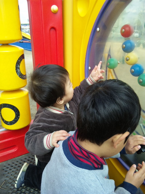 今日は、朝一で銀行へ行き、マイホーム資金の一部を支払ってきました。三人連れての銀行来店とわかっていたので、振込用紙と払出請求書は、前もってもらって帰ってて家で書いていきました。まぁ。三人バラバラで動いてくれるもんだから、お母ちゃんちょっと大変でした1号は、ヒラヒラカーテン(!?)に隠れて、『お母ちゃん、1号ど~こだ?』とかくれんぼしてるし、2号は、キャッシュコーナーの仕切られてる経路をたどって、まるで迷路気分(笑)一度ならともかく、何度もしちゃってるし3号は、本コーナーのポケモンの本をごみのごとくごみ箱に捨ててるし…。融資コーナーに入りこんで取引している人の横の席に座ろうとしてるし…。でも、3号は、銀行員さんがみてくれて助かりました。事務処理の待ち時間も、一度は三人ともお母ちゃんと一緒にイスに座ったのに、気づけばいないし3号くん、同じくらいの女の子を見つけ、何やらアピールしてました。その姿がなんとも可愛くて・・・3号くんのことが可愛くて仕方ない1号とお母ちゃんは、3号のその姿をニヤつきながら眺めていたのでした。その後、公園に行き、お母ちゃんも一緒に遊びました。周りはお友達と一緒に来ている人が多く、仲良く遊んでる子供たちに、井戸端会議に花を咲かせてるママたち。私は、そんな光景を羨ましく思いながら、子供たちと遊びました。(さすが1号くん。しっかり3号くんの横をキープ)(下が見えて怖いよぉ~~~)(『お母ちゃん見てみて~』と渡ってる2号くん)(動けなくなった3号くん。ヒーローの1号にいにが助けに来てくれたよ~)(ダメダメカメラマンせっかくの3人を撮ったのにお母ちゃんの指が~~!!)いっぱい遊んで、早めの昼ご飯を食べに近くのお店へ。マックがいいというので、子供たちのリクエストにマックへ。しかも、『お店の中じゃなくて、外で食べたい』『鳩がおるとこで食べたい』というので、外で食べましたよ風があったので、誰も外のコーナーで食べてないし…。お母ちゃん、肌寒い中で食べましたよ。でも、子供たちは、寒さなんて関係なさそうで、鳩が周りに来る度に、はしゃいでました誤ってポテトを落とした時は、鳩が何羽来たでしょう。1号は、面白がって、明らかに故意にポテトを鳩にあげてるし食べたら、その後は、お店のあらゆるちびっ子広場やちびっ子コーナーに行き、遊ばせました。お母ちゃん、この時は、ちょっと休憩させていただき、子供たちが遊んでいるのを見てました。カメラマンお母ちゃんに再び変身(楽しく遊んでる1号、3号に対して2号くん、もう満足で一人退散体勢にw)(場所移動!!貸切でした~ここでもいっぱい遊んだよ)(1号くん。珍しく『写真撮って~』と・・・1号力作積み木とパチリ)ここの広場では、『お母ちゃんのおうちも作ってあげる!!』といって、おうちを作ってくれた2号くん。写真を撮ろうとしたら、3号怪獣に倒されました(笑)2号くん。お母ちゃんのおうちを一生懸命作ってくれてありがとう今日は、久しぶりに子供たちといっぱい体を使って遊んだお母ちゃんなのでした。いつも読んでいただきありがとうございます。★ランキングに参加してます。★励みになりますので、ポチッとお願いします。足跡変わりにでも是非、ポチッとお願いします。 ↓にほんブログ村