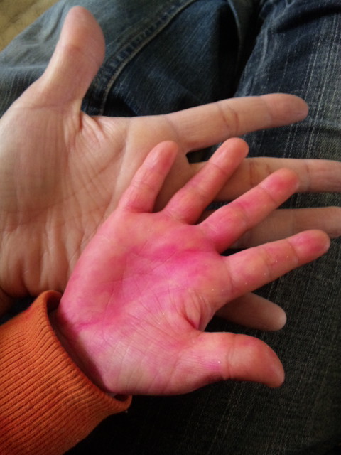 なんじゃこりゃ~~~!!この手の平、手前が1号。奥が私のです。いかに凄いか比べたらわかりますよね!?ちなみに、手の甲もこんな感じでした(笑)今日は、園で昨日の遠足の絵を描いたそうです。しかし、こんなになるくらいまでの力作なのか???見るのが楽しみです手は赤だらけだったので、聞いてみました。「ねぇ、赤色って昨日あったっけ???何を描いたん?」『お母ちゃんと1号を赤で描いた!!』「ちゃんと髪の毛や眉毛とかも描いてくれた?」と言うと、『忘れた!』だって『お母ちゃん、ハゲじゃわ~』だっておいおい!髪の毛を描くのを忘れてただって!?今、言われて気付かずにその時気付いてよ~!お母ちゃん、楽しみにしてるわさっき、カレンダー見てショックを受けました(泣)なぜなら、今日は…今日は、苅部コーチの親子ふれあいの日(ベビママ)でした。朝、1号の連絡帳を書く時にカレンダー見たのに、ちゃんと今日のところにベビママって書いていたのに、見落としてました(泣)あぁ。ショック~まっ、今週もベビママあるし気を取り直そっと・・・今日も元気いっぱいの子供たちに囲まれて過ごす母ちゃんなのでした。☆ランキングに参加してます!!励みになりますので、ポチッとお願いします。 ↓にほんブログ村にほんブログ村