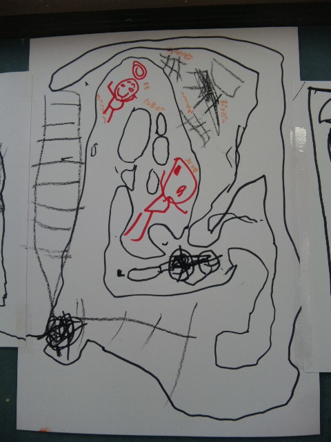 いつも読んでいただきありがとうございます。★ランキングに参加してます。★励みになりますので、ポチッとお願いします。 ↓にほんブログ村昨日のブログで書いた1号くんの絵ですが、今日、朝行ったら、教室の黒板に貼られていました。入るなりお母ちゃん記念にパチッとしちゃいましたお母ちゃんと1号を赤で描いたと言っていたので、すぐにわかりました(なるほど~。線路も描けてる。恐竜のたまごも、ハゲのお母ちゃん(!?)も)去年は、顔のみ、色も一色のみだった頃に比べると、すごくよく描けてます。よく描けてるなぁ・・・とお母ちゃん感動したわこれだけかと思ったら、先生が『1号くん、3枚描いたんですよ~』っだって!見てみると…ほんとだ!!3枚ちゃんと繋がってる。(家から駅、恐竜公園、カブトガニ博物館まで描いてありました。)(右側:これはカブトガニ博物館らしいです。)(左側:これはお家から駅までを描いてます。電車も描いてます!!)しかし、昨日のあの手からして、これだけでは汚れないですよね~(笑)こりゃ~マジックで遊んだな!!1号は、聞いても教えてくれないので、謎です・・・。お母ちゃんの推理によると、やはりマジックで遊んだに・・・違いない!!マチガイナイ今日は、絵から子供の成長を感じ、ジーンときてしまったお母ちゃんなのでした。