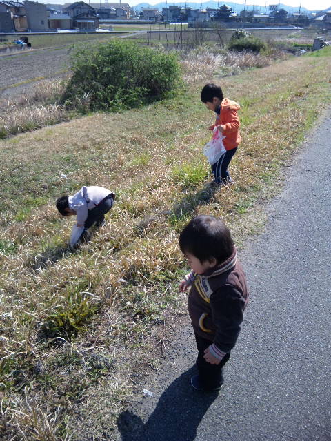 今日も子供たちは、朝から元気。3号なんて5時台に起きてたし、1号、2号も6時半ごろ起床。春休みに突入したと思ったら、いつもより早く起きるんだよね~子供って・・・(笑)今日は、実家に用事があったので、昼前ごろに行く予定にしてたんですが、子供たちが『ばぁちゃんちに早く行こうよ!!』っていうもんだから、家事などをパパッと済ませて実家へGO9時前には実家に着いていて、こたつに入ってくつろいでましたよ今日は天気もいいので、外に出て遊ぶことにしたみつ☆る親子。でも、風が冷たいそんな中、みんなで土手につくしを取りに行きました。最初は上の方で取っていたんですが、車の通りが多いし、子供たちが危なくて危なくて・・・。(毎年取ってる1号と2号くん。見つけるのもおてのものでした!!3号は・・・来年に期待)みんなで取ったから、袋いっぱいになりました今日の珍事件。ばぁちゃんちの前にある空き地で子供たちとボールで遊んでた時のこと。空き地の隣のおばさんと母が話してて・・・おばさんが3号に『ボールをコロンしてごらん!』と言いました。それを聞いた3号は・・・ボールを蹴ると思いきや、自分がコロンしたんです確かにコロンしてますが(笑)しかも、超スローでコロンしたんです!下にゴロンしたら痛いとわかったのかな!?もう、おかしくて、みんなで大爆笑しましたよ(笑)お昼ご飯を食べて、買い物に行きました。子供たちに靴を買ってもらいましたそして、お母ちゃんも母に服を買ってもらいましたラッキーお買い物も済ませ、遊べるところ(有料)へ移動。(3号くん。この体勢がお気に入りだったようで・・・何度もしてました)汗をかいて遊ぶ3人なのでした。(元気100×3倍、三兄弟)実家へ再び戻ってからも、外遊びした3人でした。お母ちゃんは、3人をばぁちゃんに託し、車の掃除をしました今日は、実家で少しのんびりさせてもらい満足なお母ちゃんに、いっぱい遊んで満足な子供たちなのでした。おまけ旦那が休憩中に写メを送って来てくれました。会社の桜だそうです確か去年も、おととしもこんな写メくれたなぁ。桜の満開ももう少し。満開が楽しみですいつも読んでいただきありがとうございます。★ランキングに参加してます。★励みになりますので、ポチッとお願いします。足跡変わりにでも是非、ポチッとお願いします。 ↓にほんブログ村