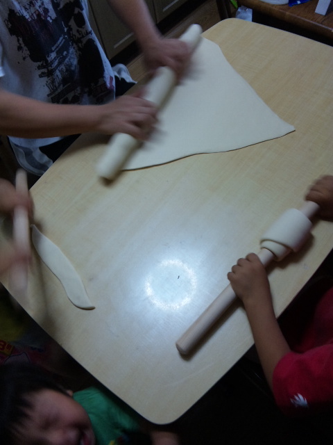 今日は、雨ずっと眠気があり、一日中ゴロゴロのお母ちゃんでした。旦那に言わせると、今日の私は、超がつくほどの【ぐ~たら嫁】だそうです(笑)昼ご飯も旦那が作ってくれたし、私は、それを食べた後、3号とお昼寝ほんと今日は、気分的に何もしたくないお母ちゃんでした。皆さんもそんな日ってありますよね!?昼寝から起きると、お父ちゃんと1号と2号が何やら作ってるじゃありませんか!!何を思ったのか・・・なんと【うどん】を作ってました。お父ちゃん、簡単にできるうどんの作り方をネットで調べたらしいです。旦那曰く、【手抜きうどん】らしいです。普通は手でしっかりこねるんですが、手は使わず、子供たちと足でコネコネしたらしいです。なんかとっても楽しそうでも、3号とお母ちゃんは今日も見てるだけ~(笑)(しっかり伸ばしている我が家の男ども。大泣きの3号。ブレまくってすみません)出来上がりのうどんを早速いただきましたかなり厚みのある太いうどんでしたが、おいしかったです美味しくなかったら、お好み焼きにでも入れよう!!なんて言ってた私。こんなことを言っちゃうお母ちゃんなんです…(笑)でも、その必要が全くなく、おいしかったです!!作ってくれて有り難いのに、いつも文句ばかりいってしまうお母ちゃんなんですが、今日は褒めました褒めて…ほっぺにチューとやらをしてみましたもちろん子供たちの前でしかし、ほっぺに汗がダラダラとは気付かずにしたもんだから、ほっぺがしょっぱい…「しょっぱ~~~~~~い!!!!!!」と雄叫びと共に、笑うお母ちゃんとお父ちゃん、そして、息子たちがいたのでした。今日は、超ぐ~たら嫁に、働きもんの旦那さまと息子たちに、和気あいあいとしたみつ☆る家なのでした。いつも読んでいただきありがとうございます。★ランキングに参加してます。★励みになりますので、ポチッとお願いします。足跡変わりにでも是非、ポチッとお願いします。 ↓にほんブログ村人気ブログランキングへ