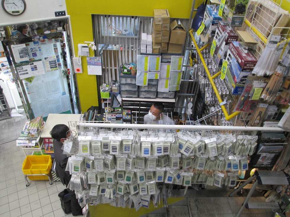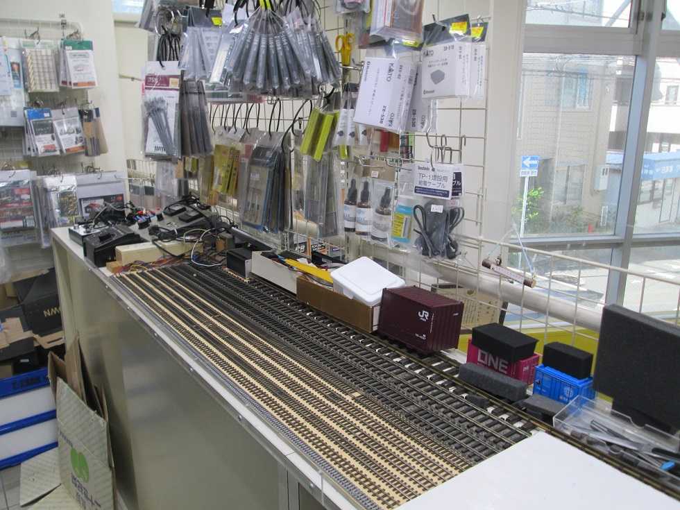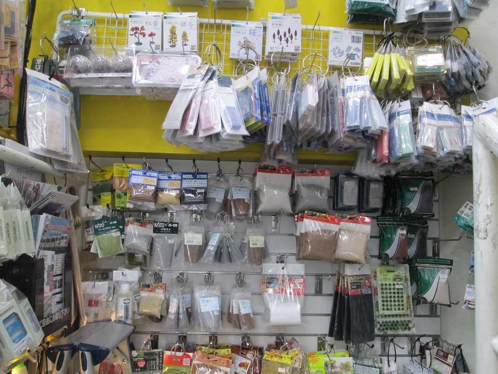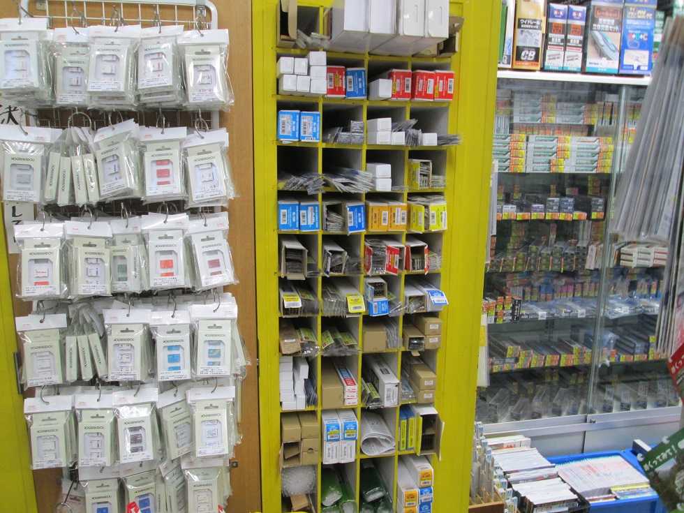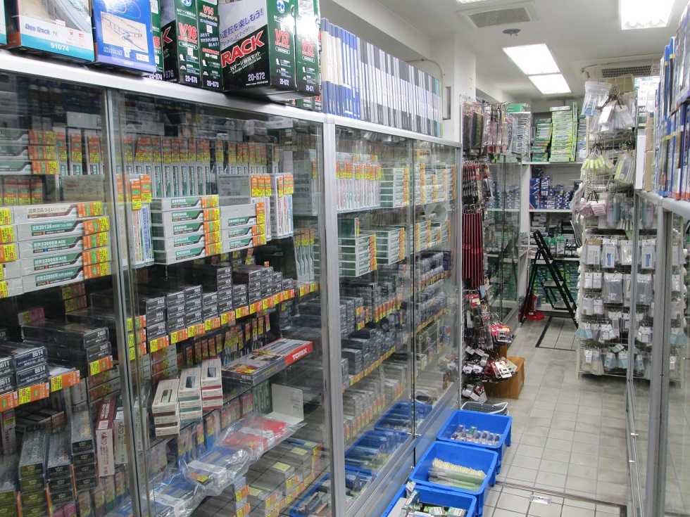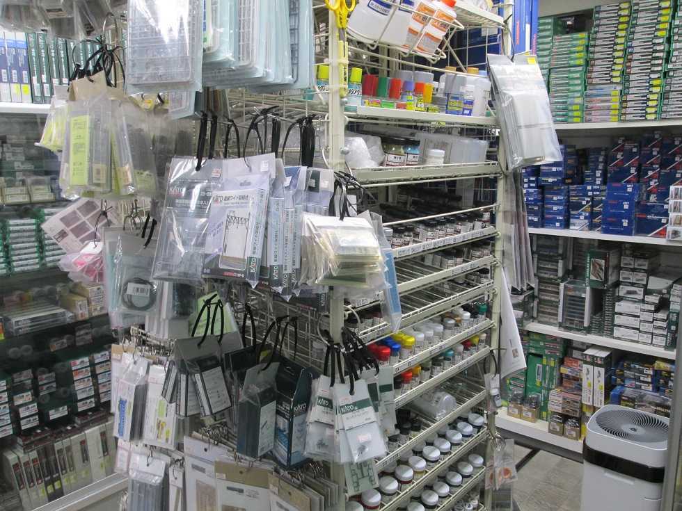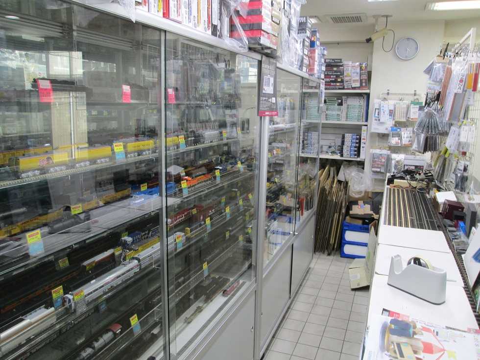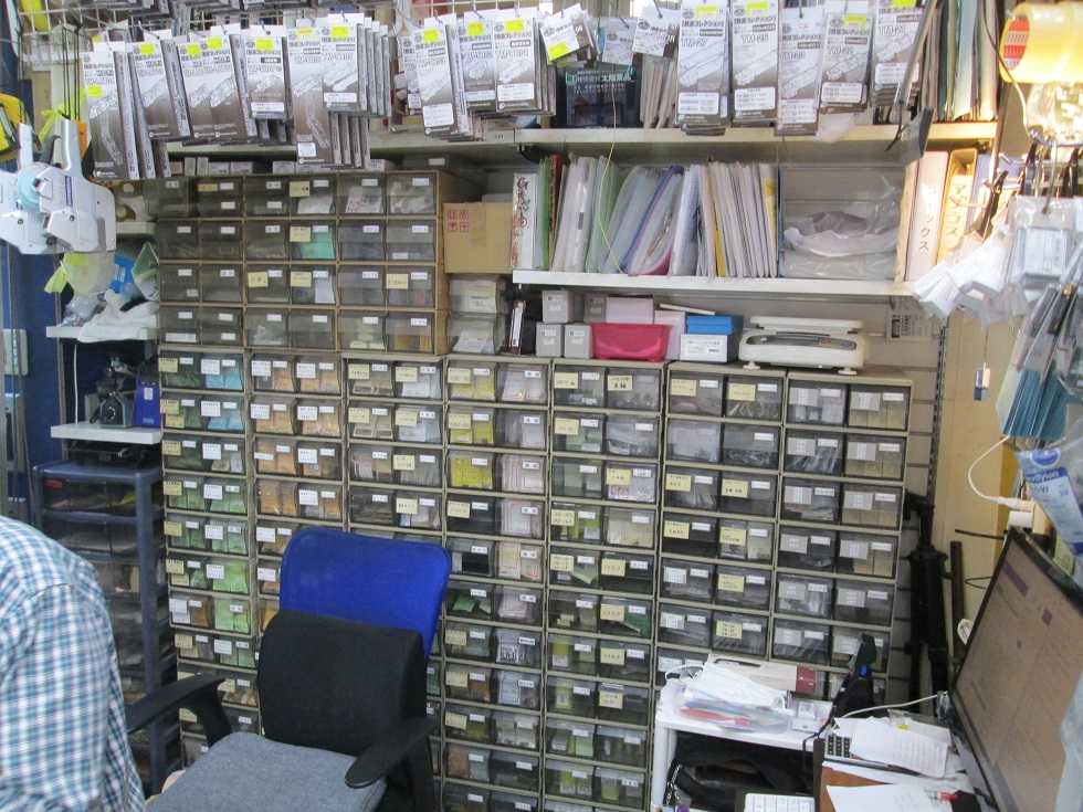 1階にあるアルミ、真鍮の棒、アングルなど、素材関係のコーナーです。自作マニアにはたまりません。写真に写っていませんが、棚の右裏にはKSやIMONの素材が陳列されています。エコーモデル、IMON、天賞堂と同じレベルの品ぞろえです。
