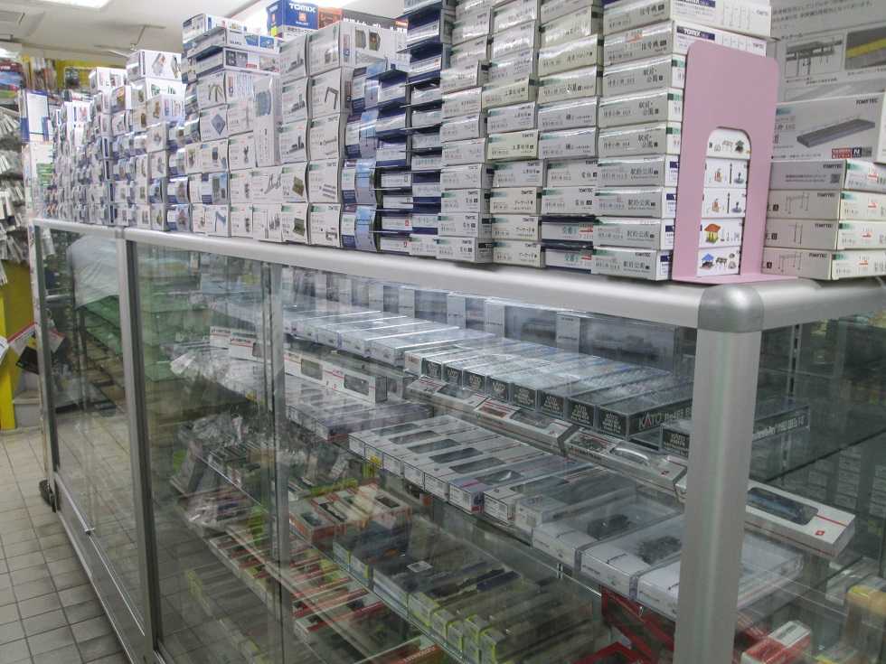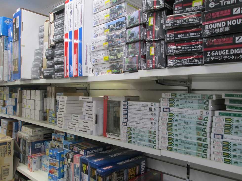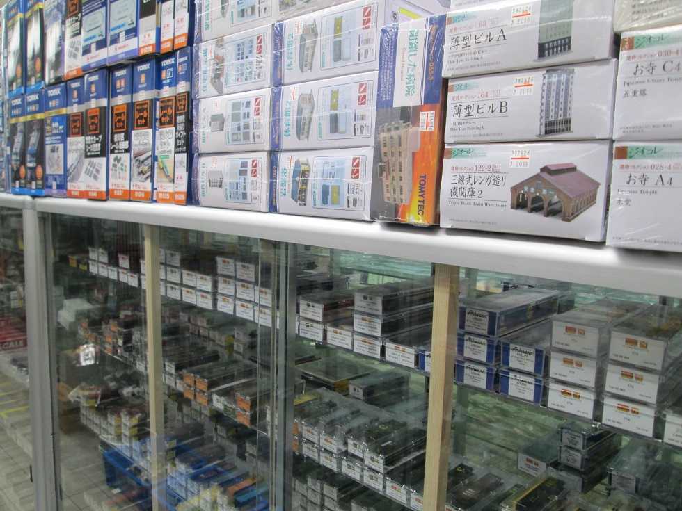 同じく1階のNゲージの車両とストラクチャーです。見やすいので自分でも探せないことはないですが、ともかく商品量が多いのでお店の方に聞くのがよいと思います。