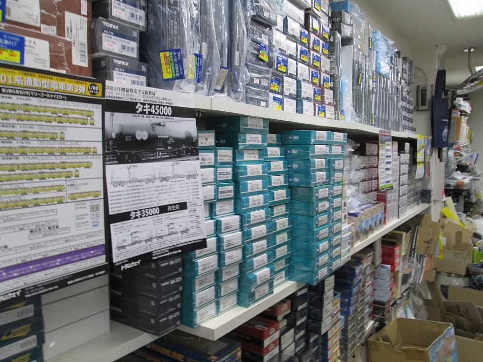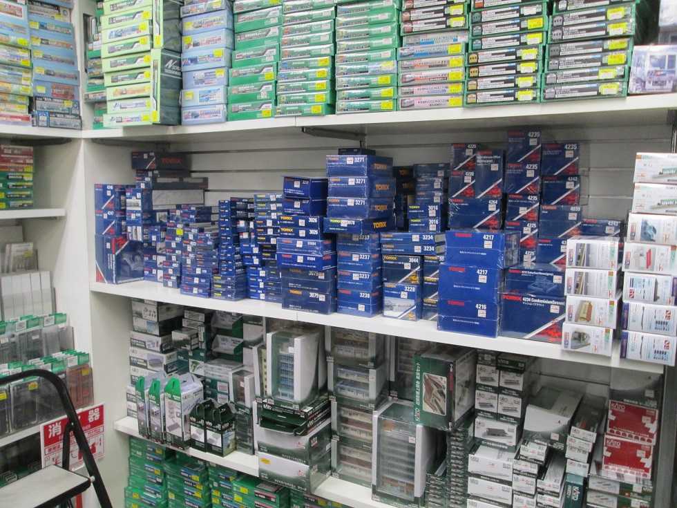 1階のNゲージの車両とストラクチャーです。ほこりや箱のつぶれなどもなく、整然と陳列されています。
