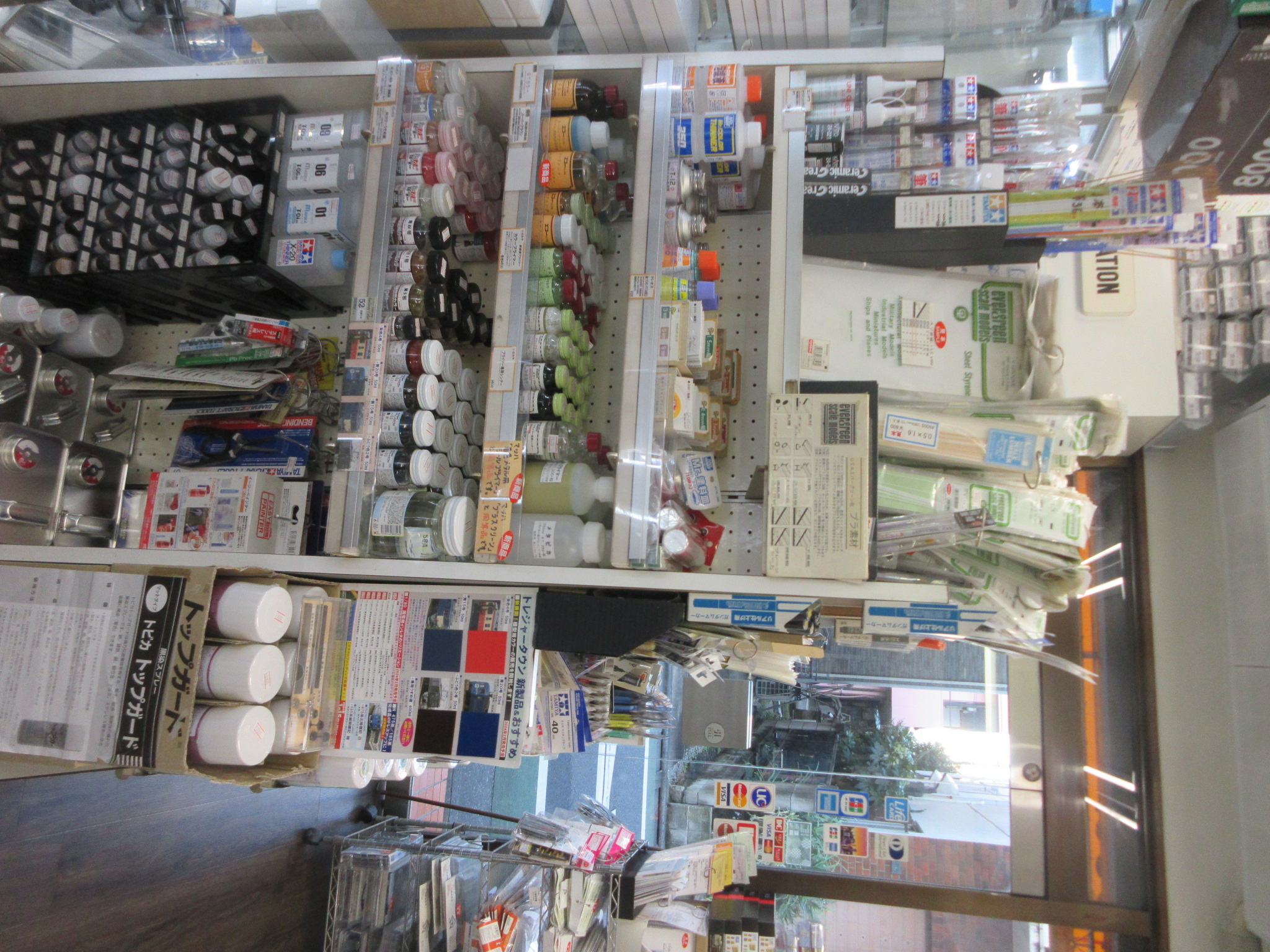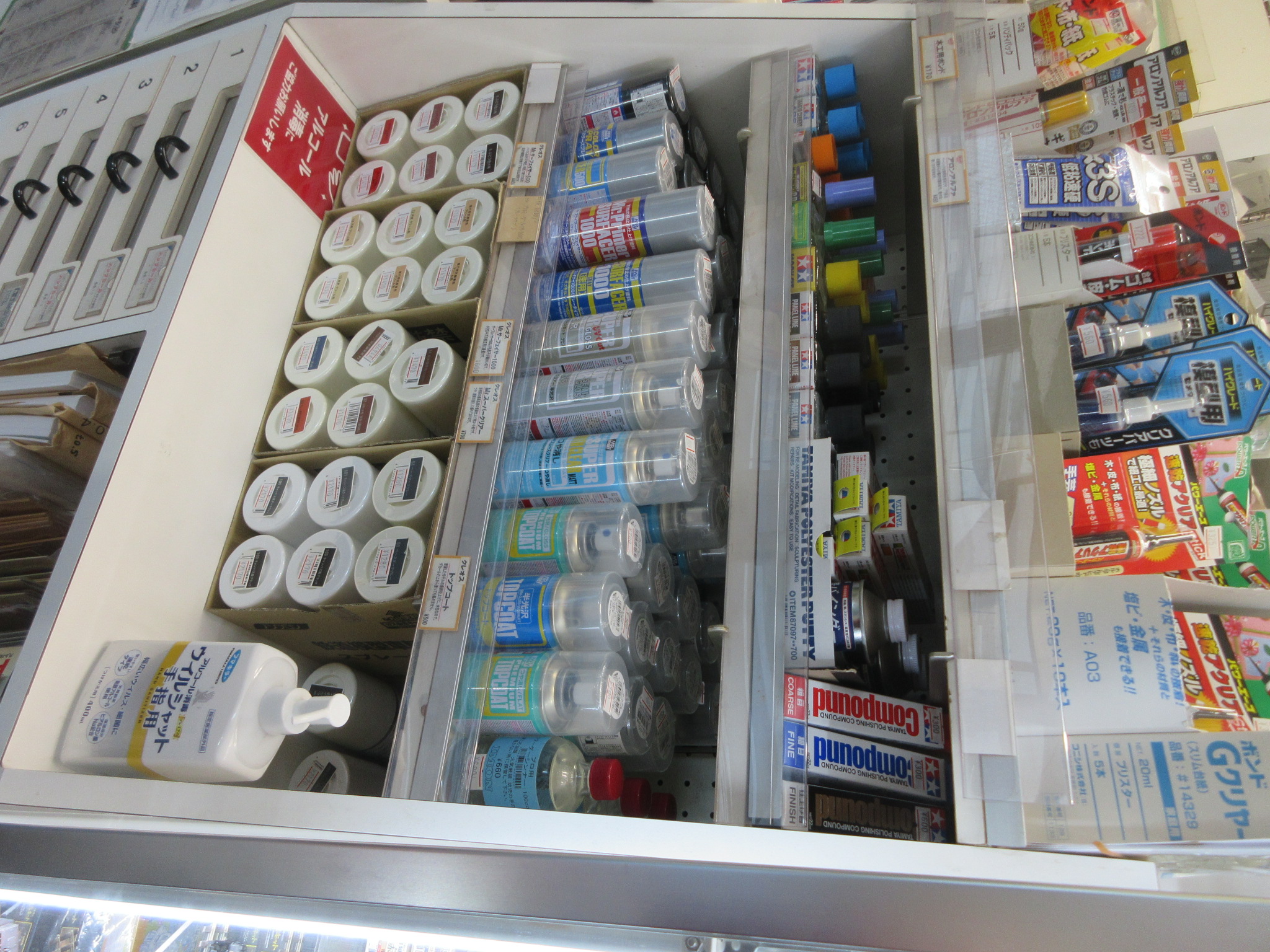 接着剤なども皆さんがモデラ―ですので、抜かりない品ぞろえです。艶消しクリアの在庫もさすが。