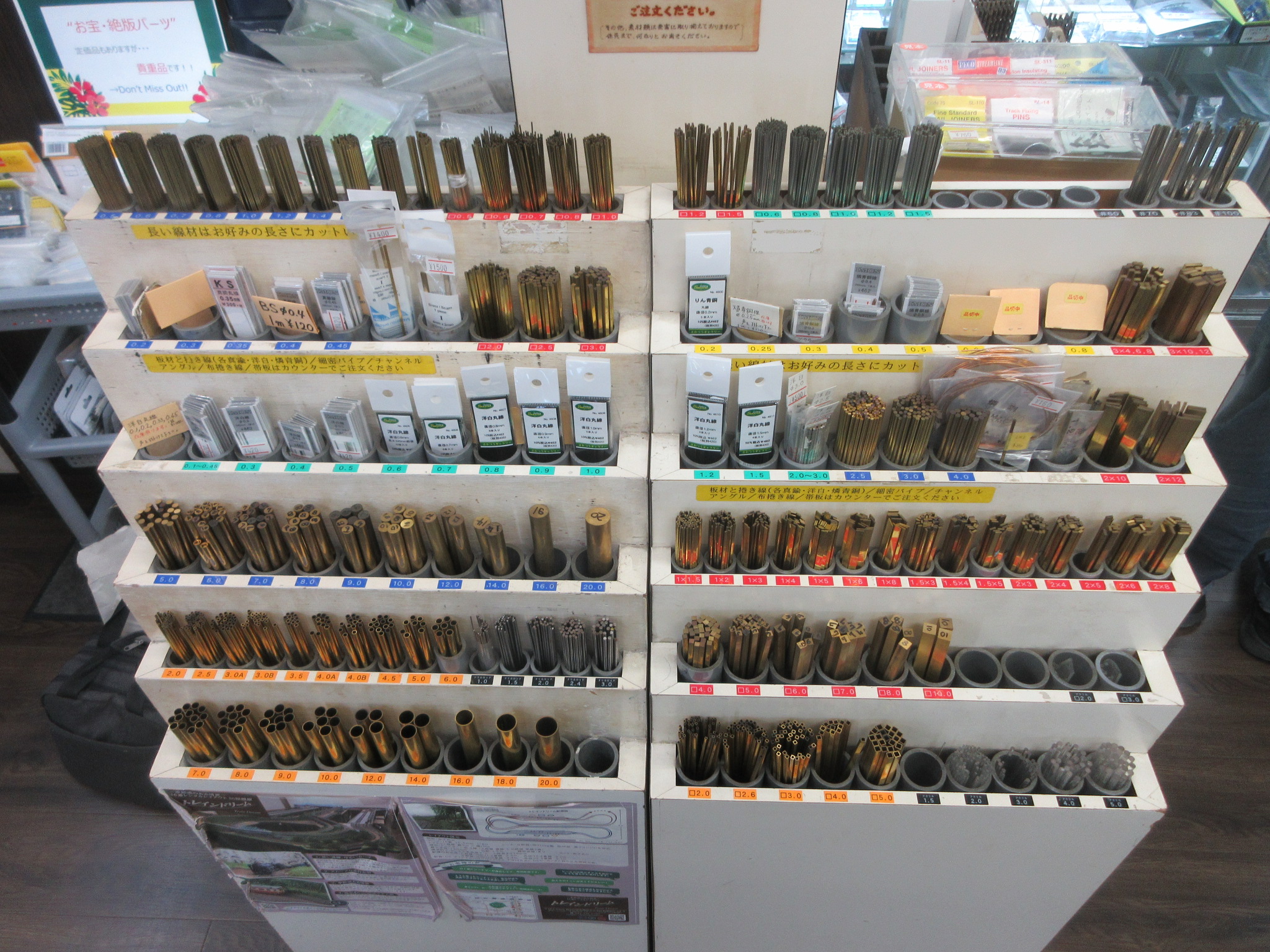 「土日に慌てて買いに来て、0.2mm真鍮線やリン青銅線がないので工作が止まった。」ということはなさそうです。行けば必ずあるという安心感は今や非常に貴重です。