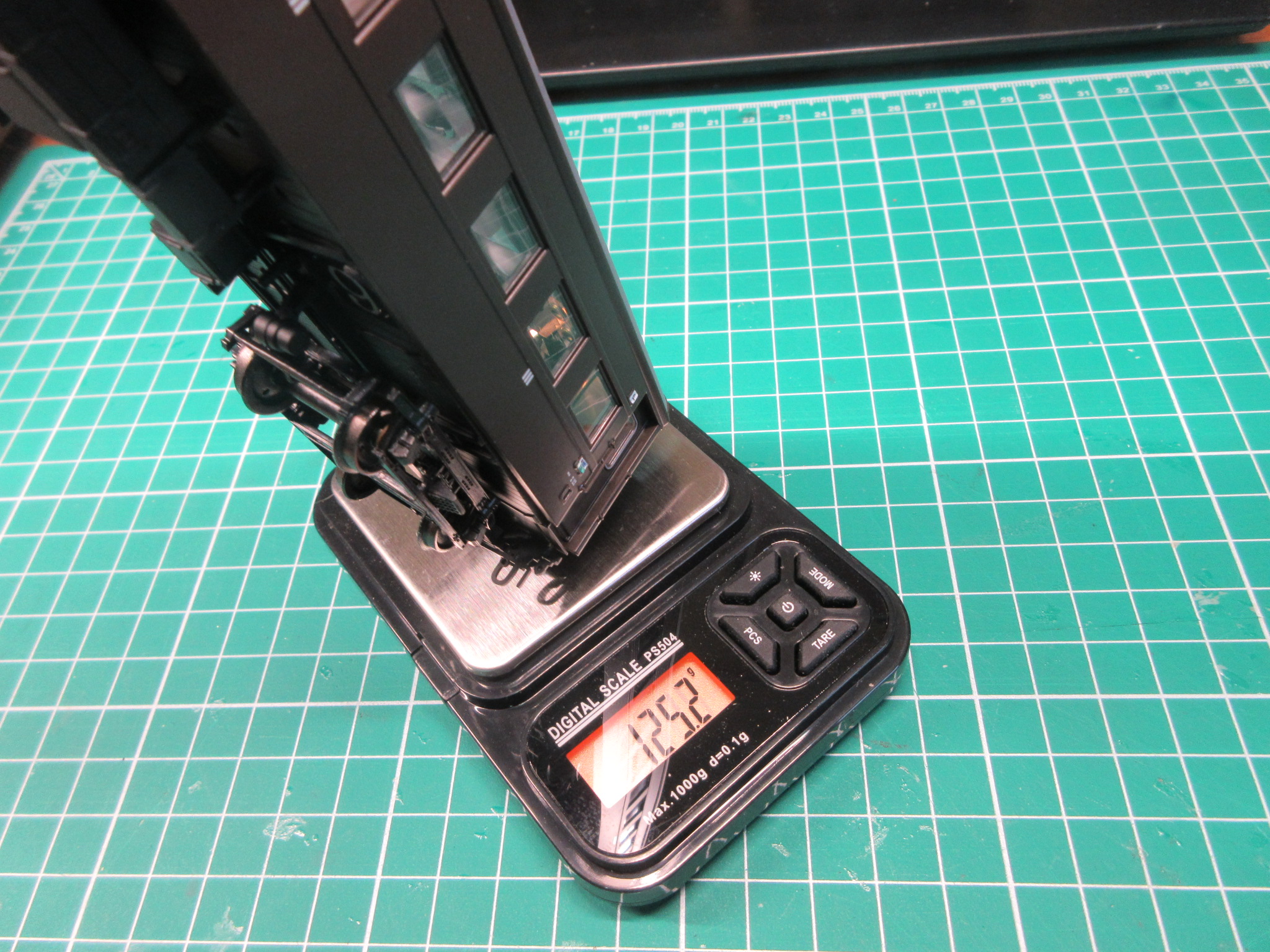 ③と同型機ですが、コアレスモーターに交換する前の棒モータでは天賞堂のブラス製軽量客車7両編成が牽引できていたのに、交換後は写真のように20gのウェイトを車体に載せても動輪が空転し、牽引できなくなっていました。