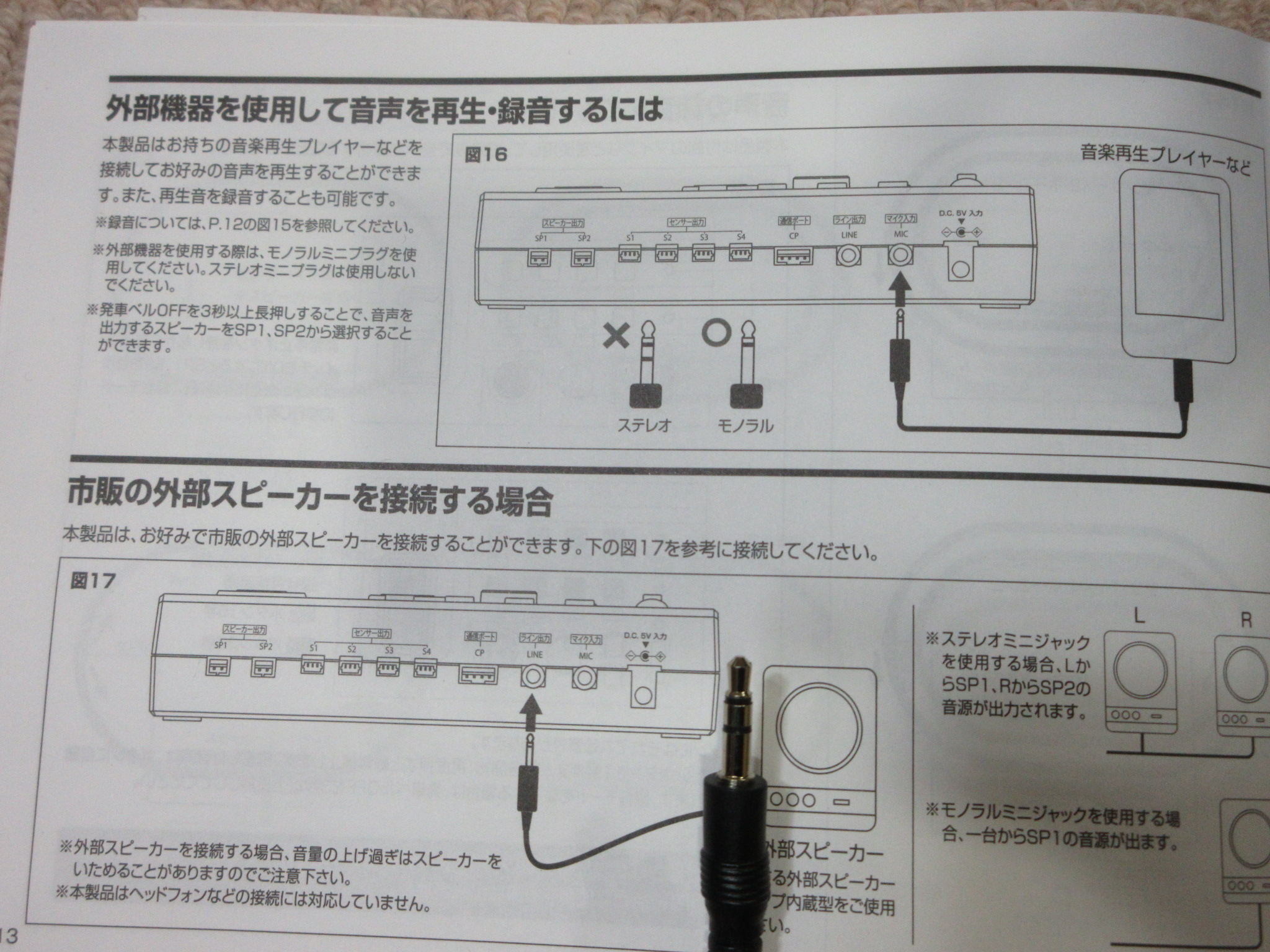 は裏面のプラグから接続します。通常はステレオスピーカーの筈ですが、スピーカージャックを差し込んでも、実質は モノクロ再生