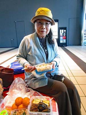 1月16日午後1時10分「石見神楽」のステージが終了すると、次の演目までの1時間に「にぎわい市」会場を回ることに致しました。平日でも大変な混雑です。私の好きな「花山うどん」を見付けました。列に並んで、「鬼ひも川」を購入しました。細い通路は行き来もままならないほどの混雑ぶりで、シートで休憩することに致しました。「にぎわい市」(中央部分)シートで休憩する人々ステージ上では次の演目「郡上おどり」の準備が整ったようです。午後2時10分、岐阜県郡上市の「郡上おどり」が始まりました。「郡上おどり」こちらはそろいの浴衣を着た男性の姿も見られました。囃子方お祭りひろば観覧する人の数もぐんと増えてきました。20分間で4曲の風情のある踊りが披露されました。約4時間の滞在で、なかなか行けない全国各地のお祭りステージを観覧でき、とても有意義な楽しい時間を過ごすことが出来ました。午後5時10分からは青森市の「ねぶた祭り」のステージがあるとのことでしたが、シニアの私達には体力的に無理ということで諦めました。来年は事前研究をして、時間的にも余裕を持って、楽しむことと致しましょう。