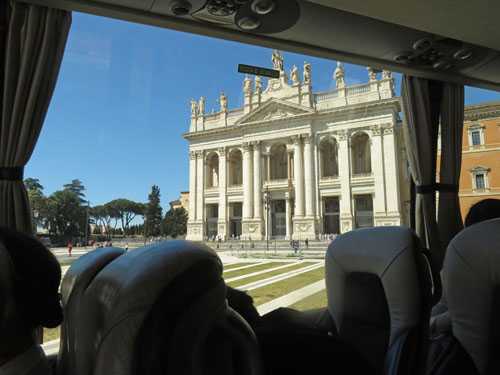 5月10日(土)コロッセオ観光を終えると、バスは次の観光地「トレビの泉」へと向かう。車窓から臨む風景博物館?教会?バスかと思ったら、市電らしい。2両編成車両大きな交差点約30分後に「トレビの泉」に到着するが、ものすごい人だかりで泉の側へ寄り付くことさえできない。これまで訪れた時は、12月と4月の初旬でこんな混雑は初めての体験である。5月はヨーロッパでもベストな観光シーズンといえるのでしょうか?「トレビの泉」へ続く道「トレビの泉」へ到着物凄い人だかり!何とか記念写真を撮って頂く。向かい側にある教会前も大変な人だかり。トイレ休憩も含めて約30分の滞在をした後、人だかりの隙間から、ちらりと横目で見て、「トレビの泉」を後にする。