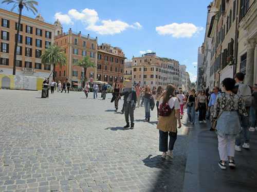 5月10日(土)11:30 トレビの泉の観光を済ませると、更に15分程歩いてスペイン広場へと向かう。スペイン広場こちらも人込みを掻き分けて進むほどの混雑ぶり。人込みを避けて写真撮影をする。スペイン広場にある噴水バルカッチャの噴水バルカッチャとは小舟・ボロ船という意味で、1629年に造られた。地面を掘り下げた所に設置されているのが分かる。これは弱い水流を噴水にするための当時の建設技術の工夫とのこと。約50分の自由昼食となる。素早く食事の取れそうなレストランを探して歩く。しばらく歩を進めると、気軽に入れそうなお店を見つける。入店すると、同じグループの方がいてお互いに驚く。持ち帰りもできるとのことでしたが、座って休憩したかったこともあり、店内で食事を取ることにする。コーラ:Tさん用カツサンド:Tさん用お水:私用野菜サンド:私用とても美味しいお味でしたが、ボリュームがあって1切れで満腹してしまう。時間を気にしながら急いで頂く。食後初ユーロ紙幣を使用する。30分後、元来た道を足早に戻る。レストランの道路に張り出した席では、地元の人々がゆったりと昼食を楽しんでいる。